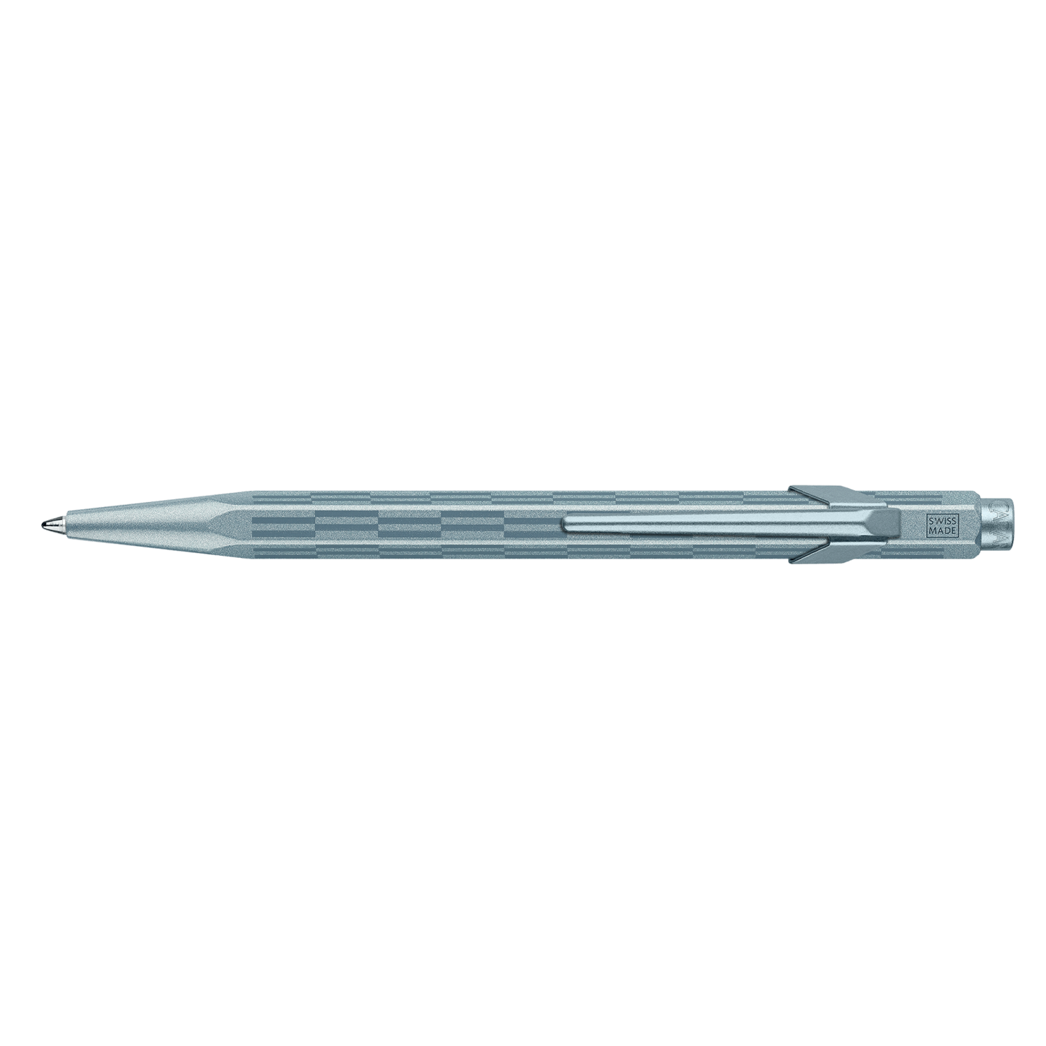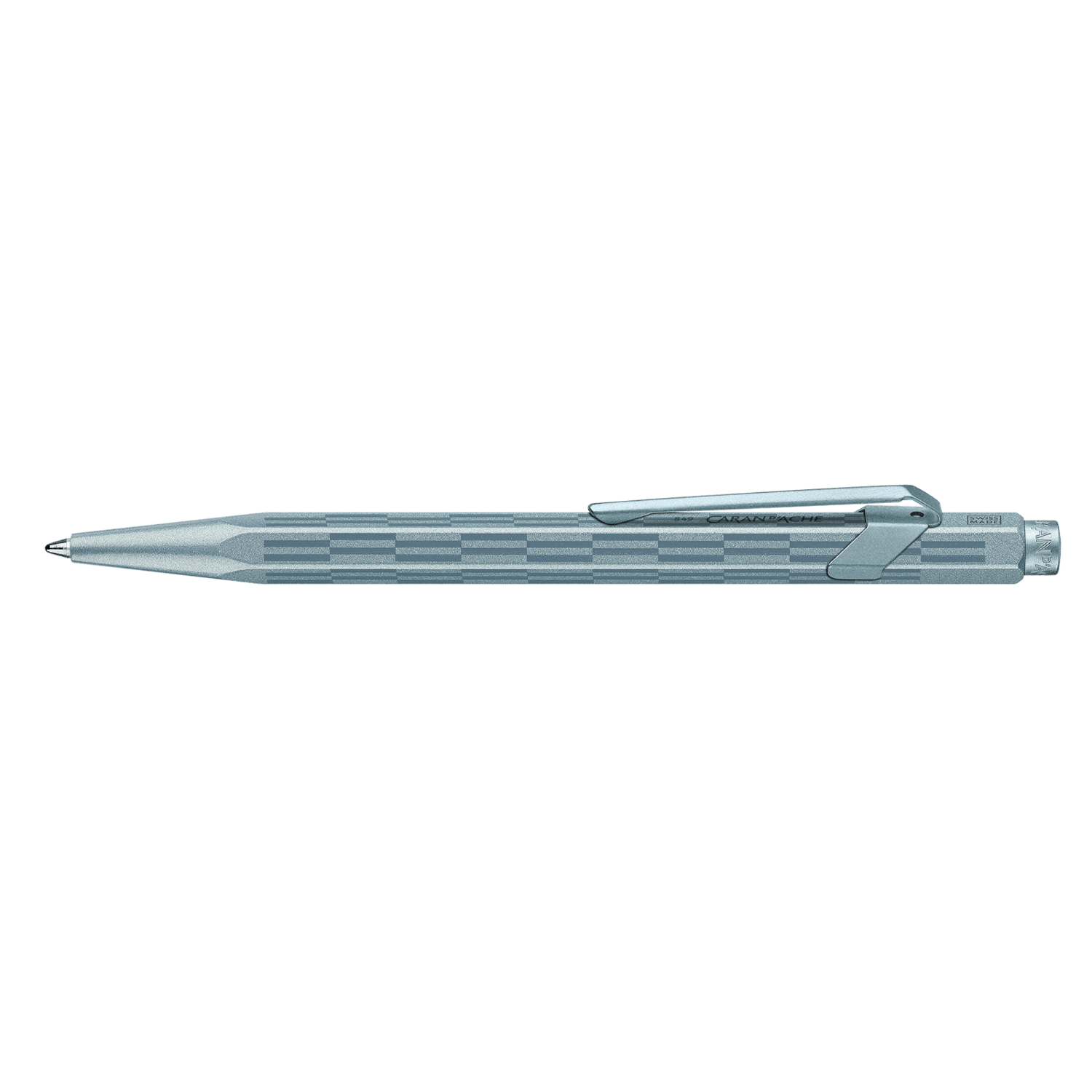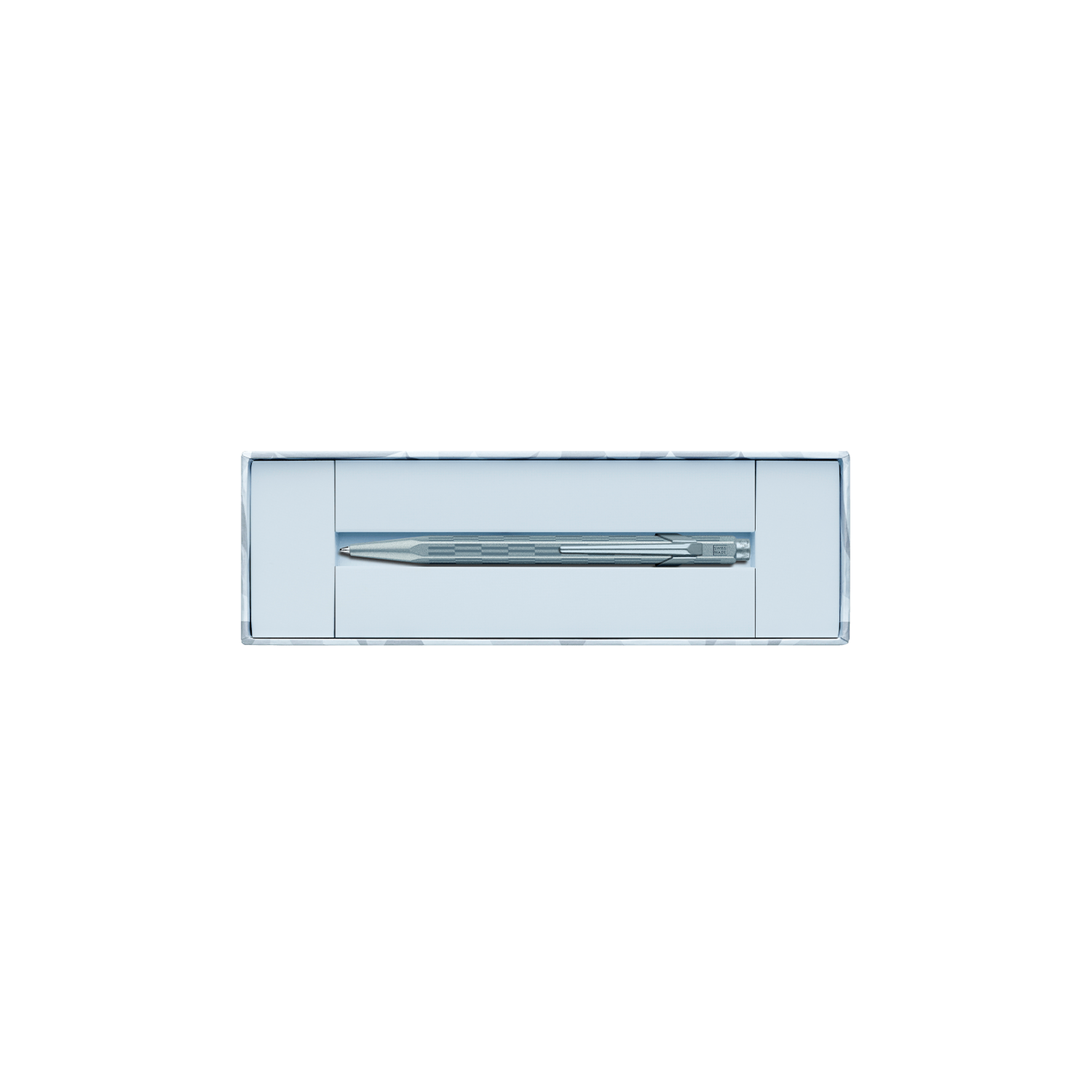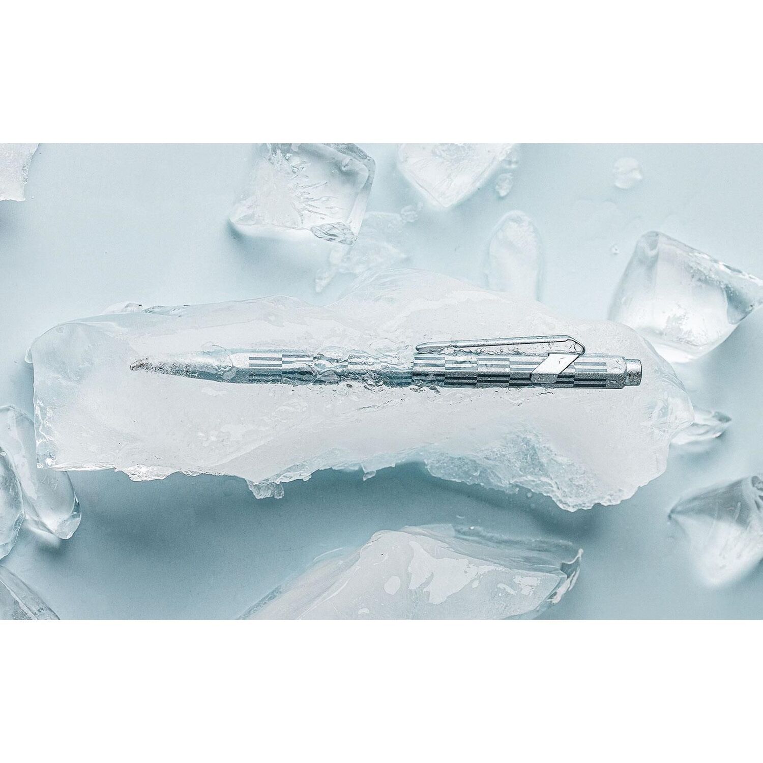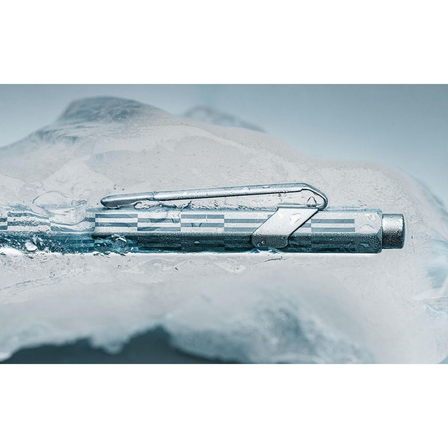 Cuerpo hexagonal de aluminio, ligero y resistente Diseño inspirado en los tonos gélidos y los reflejos brillantes de la escarcha invernal Cuerpo lacado en azul glaciar iridiscente con impresión tampográfica azul Clip y botón flexibles con barniz azul glaciar