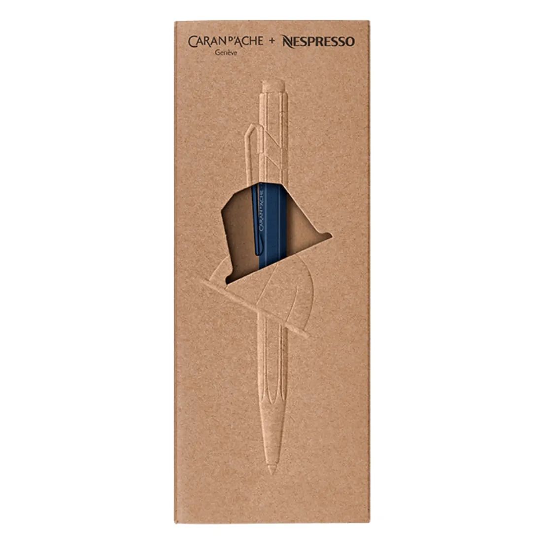 Cuerpo de aluminio hexagonal, ligero y duradero, fabricado con cápsulas Nespresso recicladas Color azul inspirado en la cápsula ?Kazaar? y apariencia metálica obtenida mediante un lacado pera Grabado con la frase GA RECYCLING STORY IS IN YOUR HANDS (UNA HISTORIA DE RECICLAJE ESTÁ EN TUS MANOS )g Botón y clip metálicos