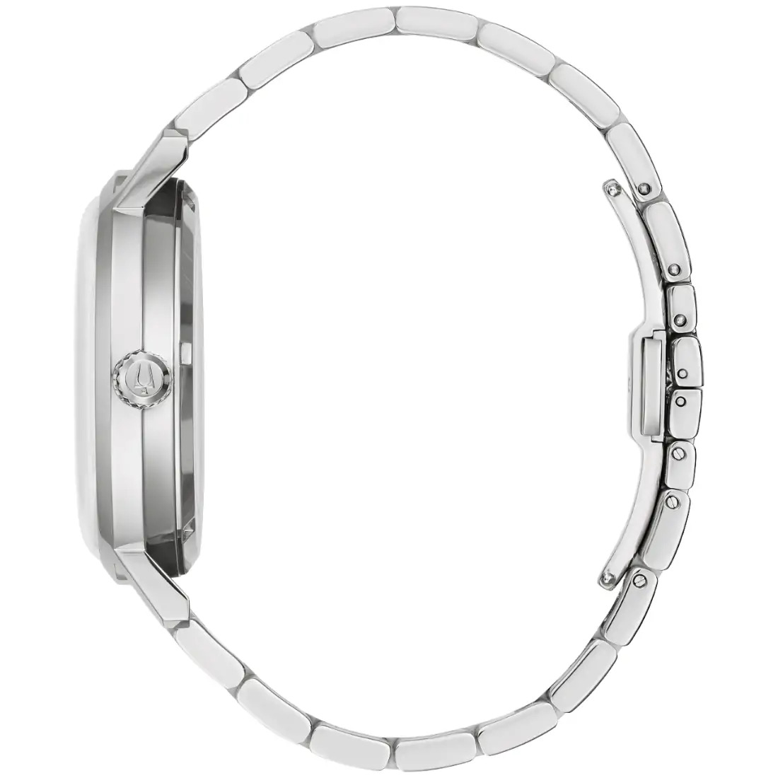 Reloj Bulova para caballero Colección Aerojet. Movimiento mecánico de cuerda automática de 3 manecillas, subcarátula indicador día y noche y fechador. Reserva de marcha de 42 horas. Caja y brazalete realizados en acero inoxidable, broche desplegable de doble pulsador. Carátula café con efectos de rayo de sol, indicadores y manecillas luminiscentes en plateado, logo vintage Aerojet. Tapa transparente. Cristal mineral.