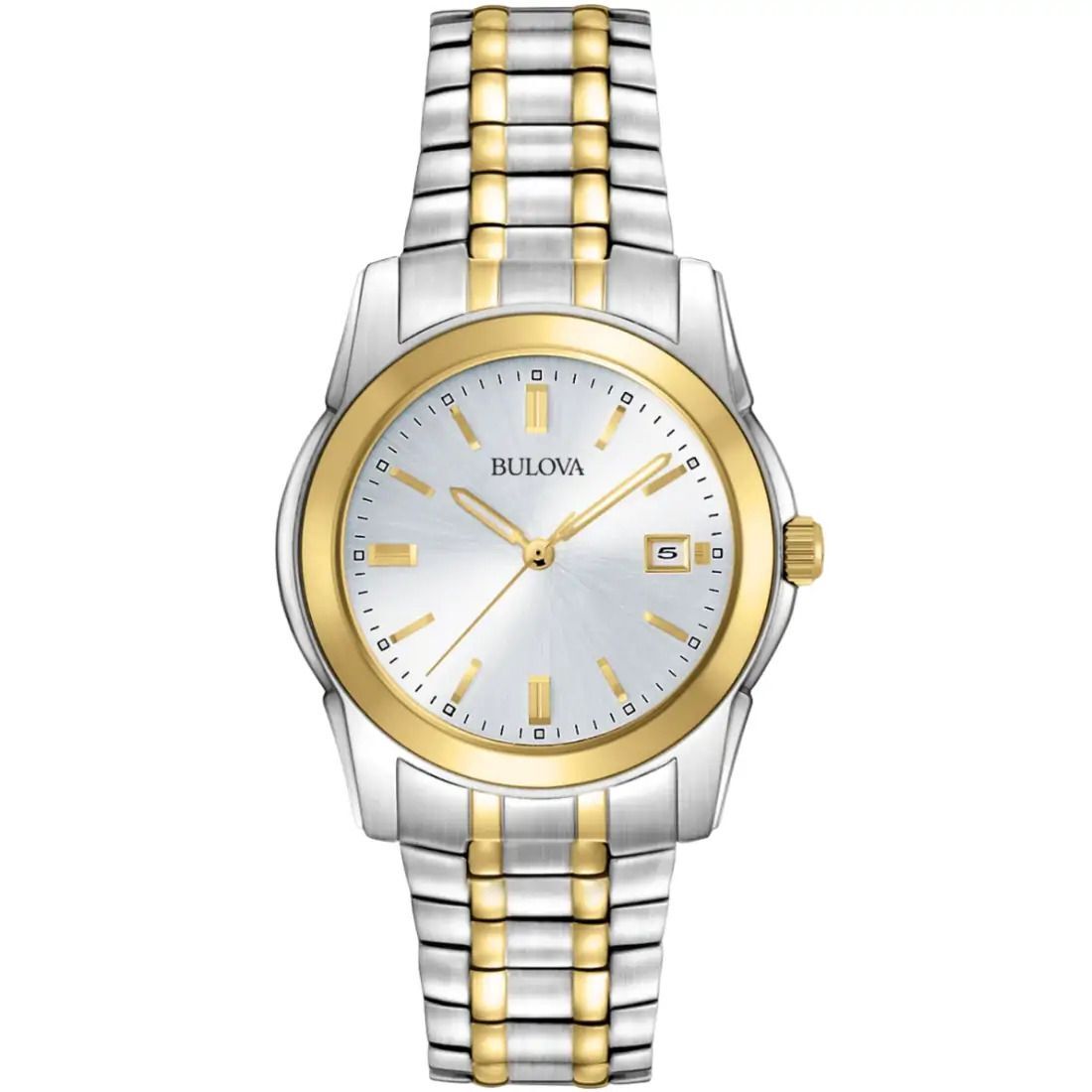 Reloj Bulova Classic 98H18 para Caballero. Movimiento de cuarzo de 3 manecillas y fechador. Caja y brazalete realizados en acero inoxidable en dos tonos acero/dorado_ con broche desplegable de doble pulsador. Car tula blanca-plateada_ indicadores y manecillas en dorado. Cristal mineral