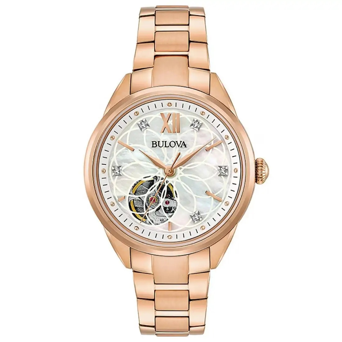 Blanco madre perla, 5 diamantes montados a mano de forma individual en carátula como indicadores, Detalles en tono oro rosa, Open Heart