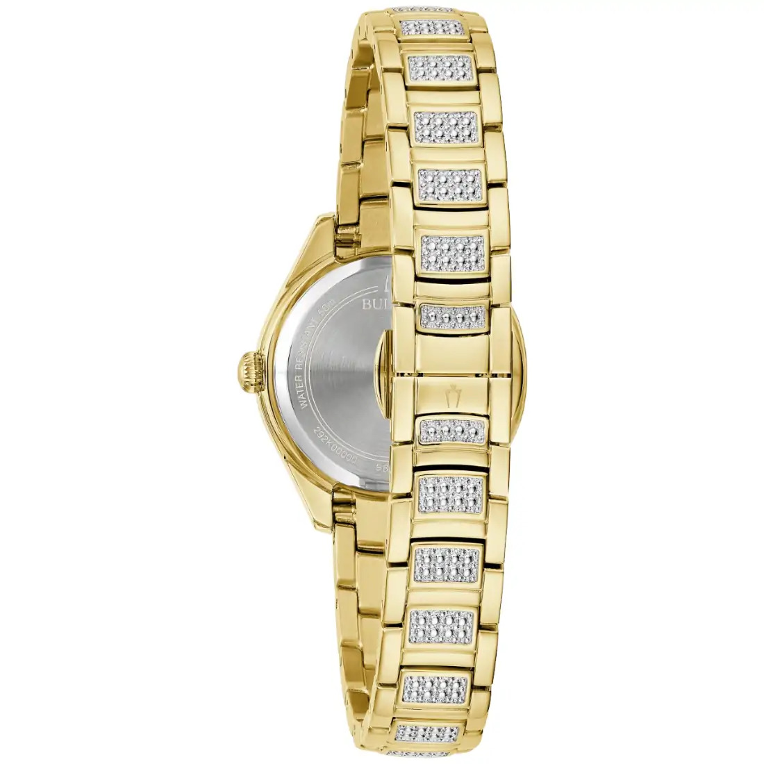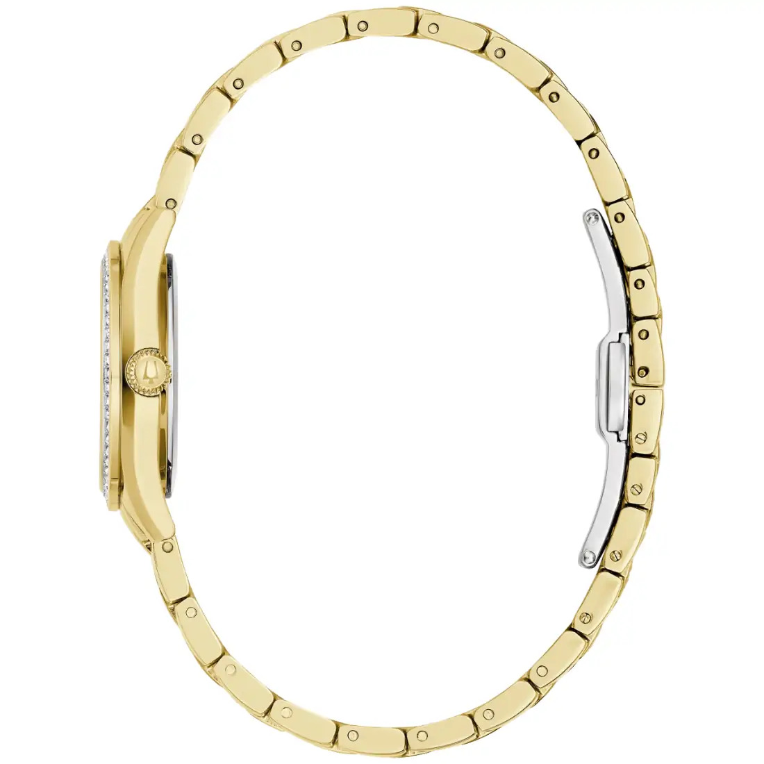 Reloj Bulova Gemini para Dama. 132 cristales montados de forma individual a mano en carátula, bisel superior y brazalete. Movimiento de cuarzo de 3 manecillas. Caja y brazalete realizados en acero inoxidable acabado PVD dorado, broche desplegable de doble pulsador. Carátula en Madre Perla blanca, indicadores y manecillas en dorado. Cristal mineral