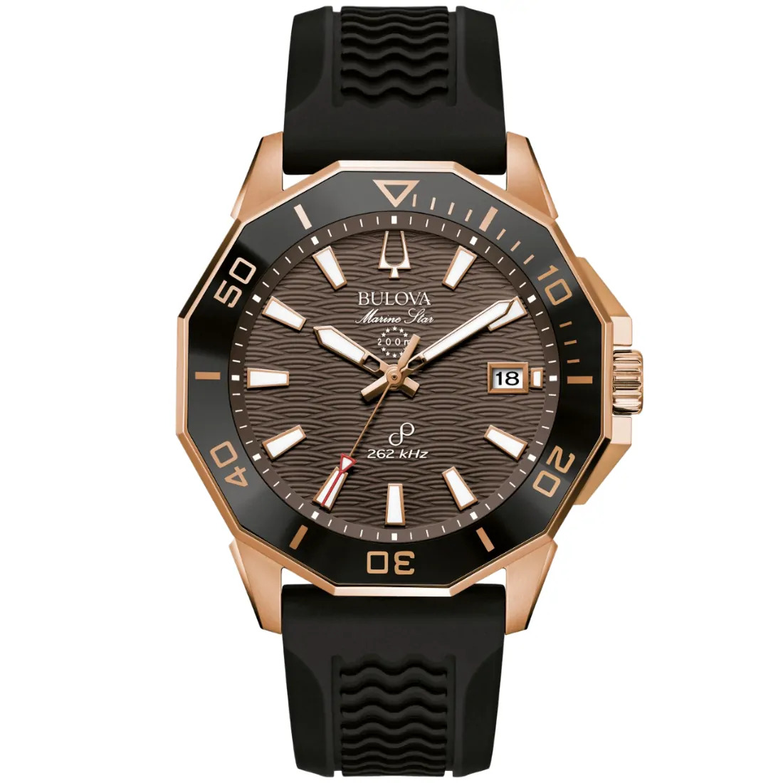 Reloj Bulova colección Marine Star para Caballero. Movimiento Precisionist de 3 manecillas y fechador. Caja en forma poligónica realizada en acero inoxidable acabado PVD oro rosa. Bisel superior unidireccional de tiempo transcurrido en tono oro rosa con inserto de cerámica café. Carátula texturizada que asemeja las olas de mar en café, indicadores y manecillas luminiscentes; segundero de movimiento continuo en tono oro rosa con detalle rojo en punta.