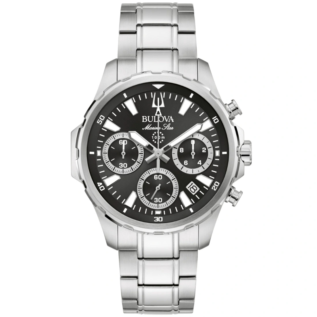 Reloj Bulova colección Marine Star series B para caballero. Movimiento cronógrafo de cuarzo de 6 manecillas y 3 subcarátulas. Caja 41 mm y brazaletes hechos de acero inoxidable, broche desplegable de pulsador. Carátula de tinte negro con manecillas y marcadores aplicados en color plata con Super-Luminova y fechador.