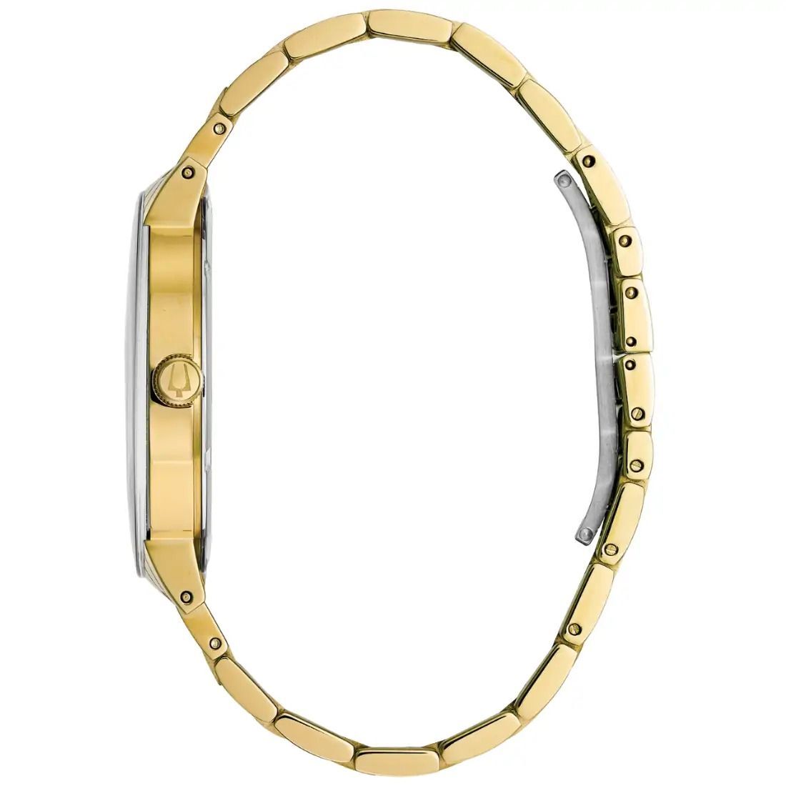 Reloj Bulova Modern para caballero.3 diamantes montados de forma individual a mano en la car tula como indicadores. Movimiento de cuarzo de 3 manecillas y fechador. Caja y brazalete realizados en acero inoxidable con acabado PVD dorado_ broche desplegable de doble pulsador. Car tula negra decorada con diamantes como indicadores_ indicadores y manecillas en dorado. Cristal mineral metalizado de borde a borde.