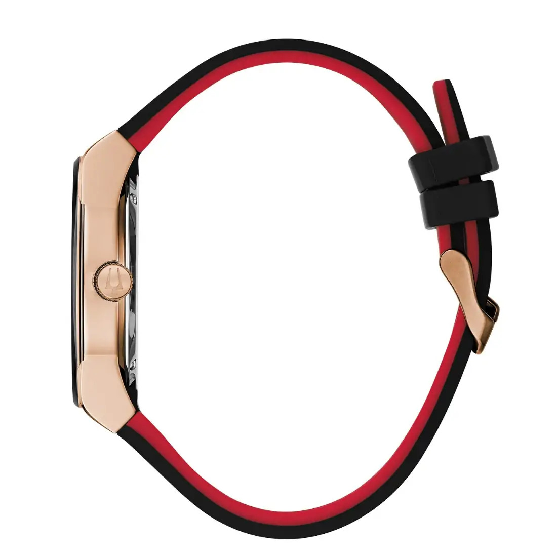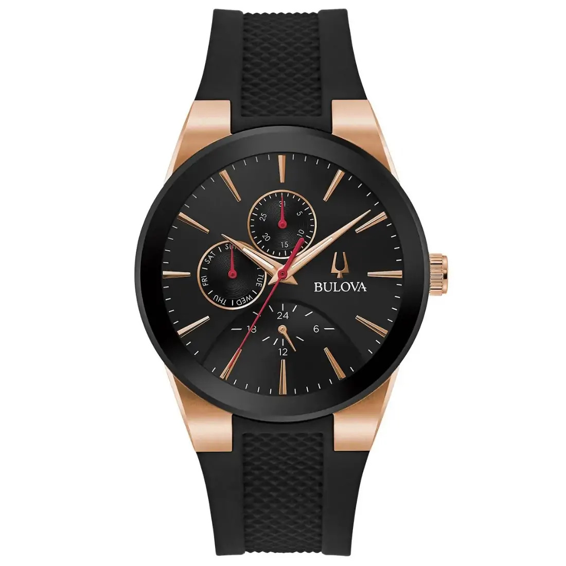 Caja atornillada de acero inoxidable en tono oro rosa con cristal metalizado negro y corona en tono oro rosa. Esfera multifunción negra de seis manecillas con día, fecha y funciones de 24 horas y detalles en tono oro rosa con segundero rojo, cristal mineral abovedado, correa de silicona negra y cierre de hebilla de tres piezas.