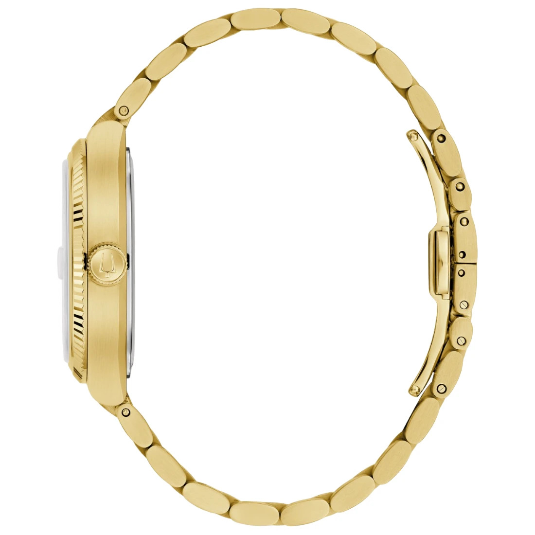 Reloj Bulova colección Archivo Histórico Super Seville para Caballero. Movimiento HPQ con una frecuencia de 262 kHz, tecnología exclusiva de Bulova de 3 manecillas y fechador con gota de aumento. Caja y brazalete realizados en acero inoxidable acabado PVD dorado, broche desplegable de doble pulsador