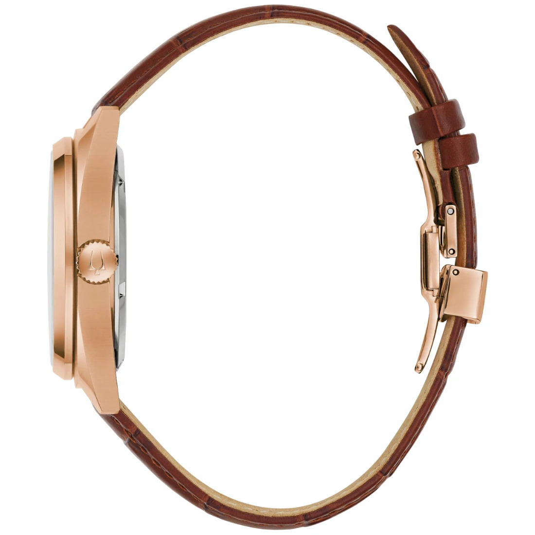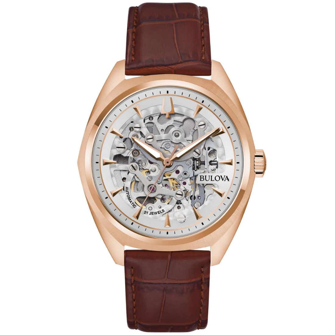 Reloj Bulova para Caballero colección Surveyor. Movimiento mecánico de cuerda automática de 3 manecillas. Reserva de marcha de 42 horas. Caja realizada en acero inoxidable acabado PVD oro rosa. Carátula esqueletada en blanco, indicadores y manecillas luminiscentes en oro rosa. Tapa transparente atornillable.