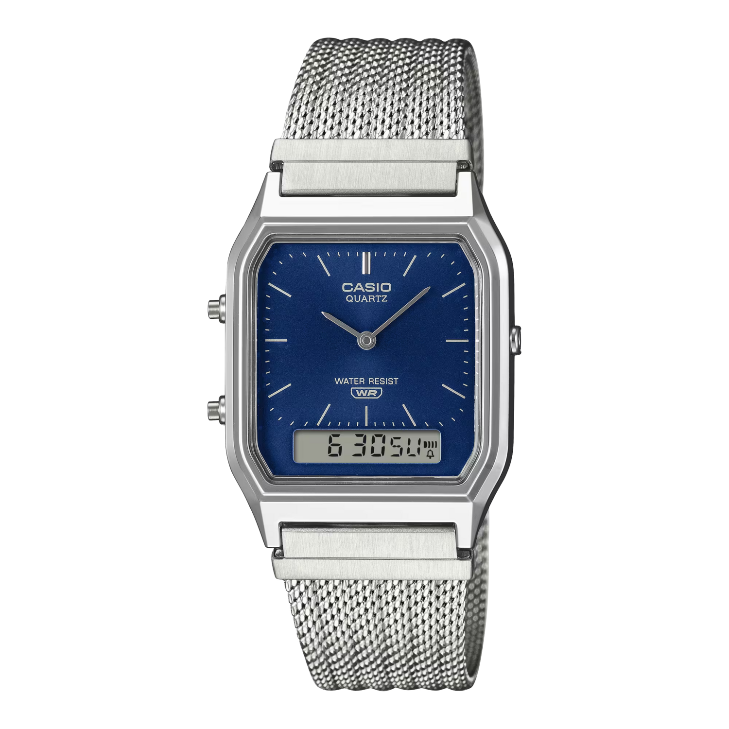 Redescubra un clásico reinventado con esta versión actualizada del CASIO AQ-230, un reloj analógico-digital que combina la estética retro con detalles modernos. Su característica esfera angular mantiene el diseño original, mientras que la nueva correa de malla de tejido fino eleva la elegancia y mejora el ajuste en la muñeca.