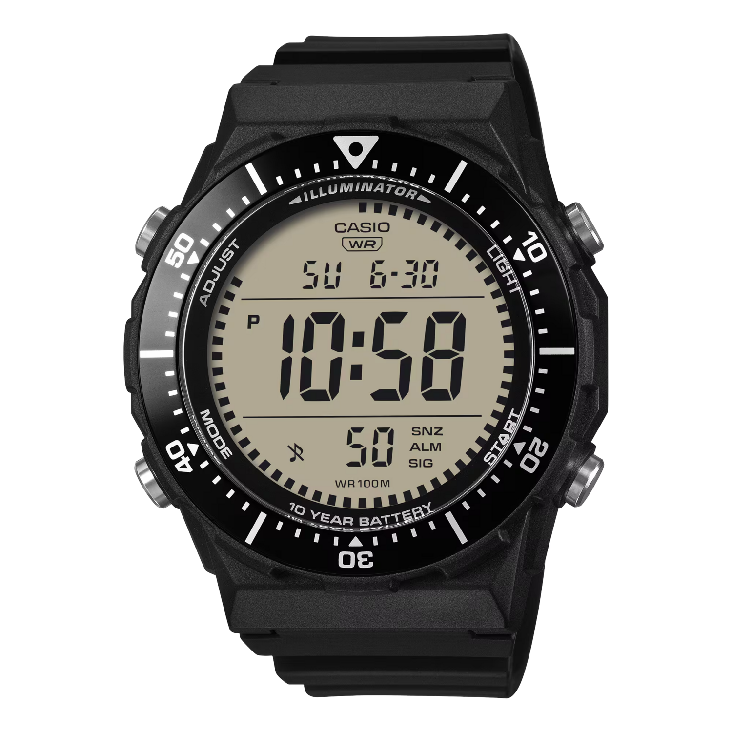 Descubre el reloj digital perfecto para los amantes del deporte, equipado con una pantalla amplia y de alta visibilidad, además de un marco giratorio que facilita su uso en cualquier actividad. Este modelo ofrece resistencia al agua de hasta 100 metros, batería de 10 años, retroiluminación LED y funciones esenciales como cronómetro, alarma y más. Un reloj diseñado para durar y rendir al máximo.
