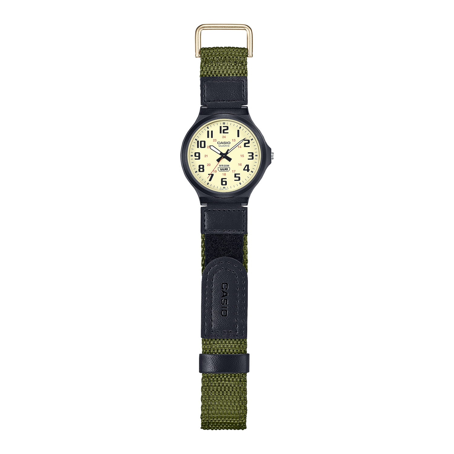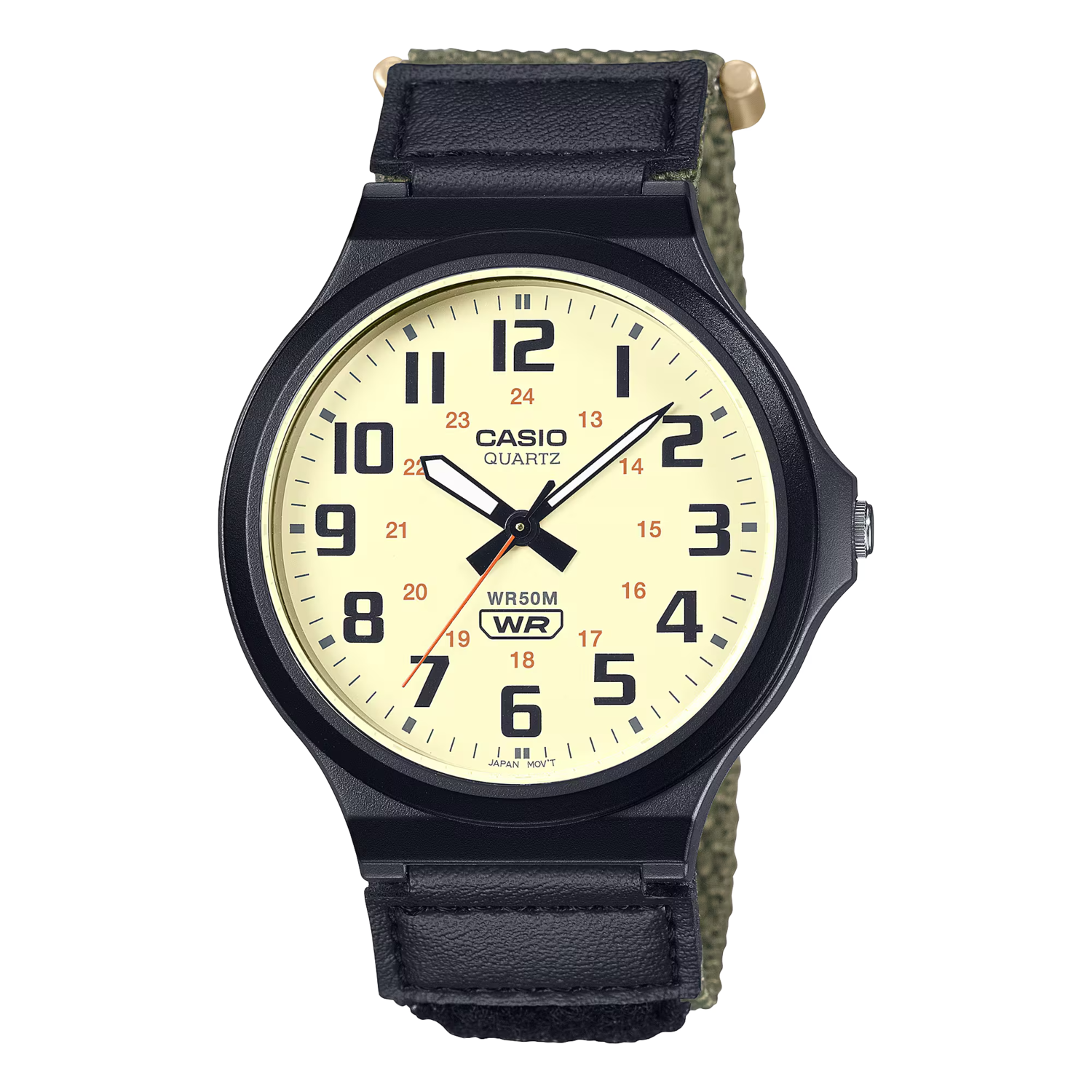 Estilo clásico con un toque aventurero: un reloj analógico elegante con carcasa grande y correa con cierre de velcro.