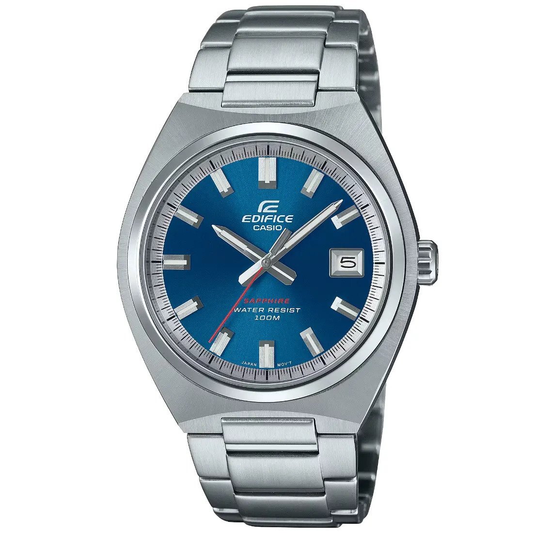 Tamaño de la caja (largo × ancho × alto): 43.5 × 38.5 × 9.2 mm Material de la caja/bisel: Acero inoxidable Peso: 127 g Correa de acero inoxidable Broche de una pulsación y triple pliegue Resistencia al agua de 100 m Fuente de alimentación: pila