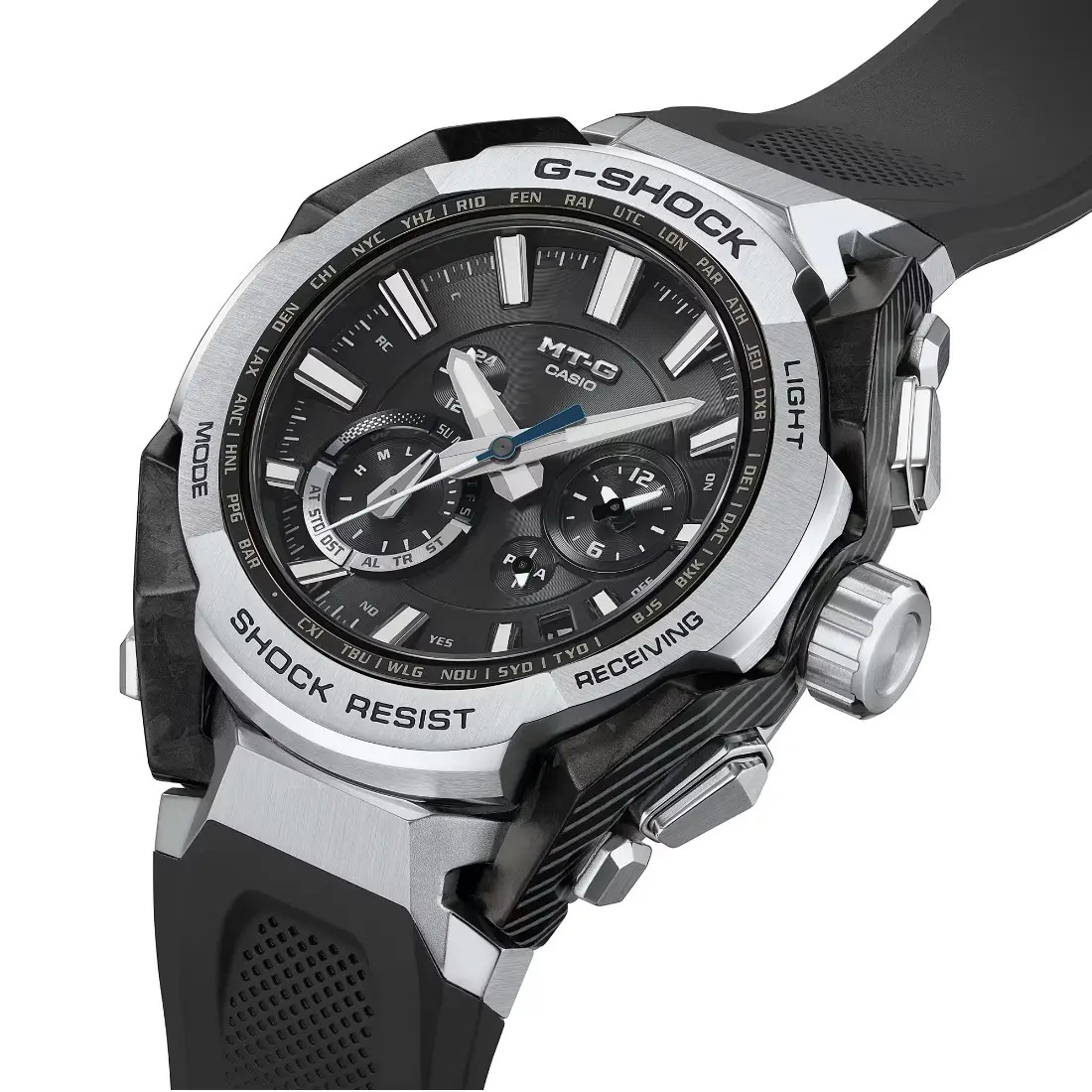 Descubra la forma innovadora y la belleza estructural: los relojes MT-G combinan materiales met licos con la resina utilizada en los primeros modelos G-SHOCK. Este reloj es una colaboraci¢n perfecta entre las capacidades de la IA y los desarrolladores humanos que integra materiales_ estructuras y dise¤os de manera creativa en un conjunto org nico de belleza funcional. Los dise¤os base creados por dise¤adores humanos se analizaron y simularon mediante IA para generar un prototipo 3D optimizado_ que luego se perfeccion¢ mediante el trabajo humano para lograr una forma £nica que sintetiza org nicamente la funcionalidad y la belleza.