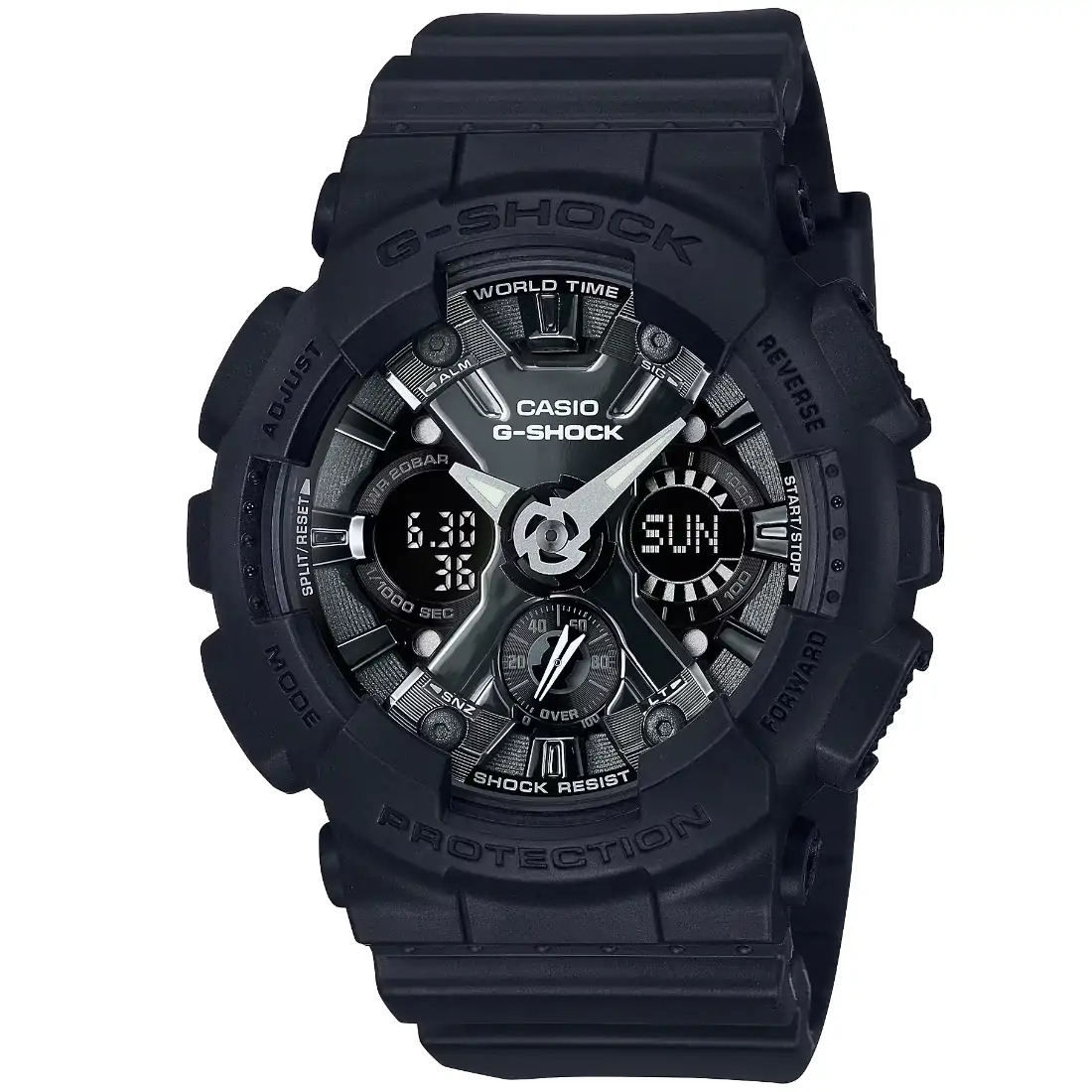 Un modelo basado en una versi¢n de tama¤o mediano del popular modelo GA-120 de combinaci¢n anal¢gica-digital. La esfera met lica y el reloj completo tienen un acabado en negro para crear un modelo casual de un solo tono. Un G-SHOCK moderno y m s peque¤o_ perfecto para la cultura juvenil.