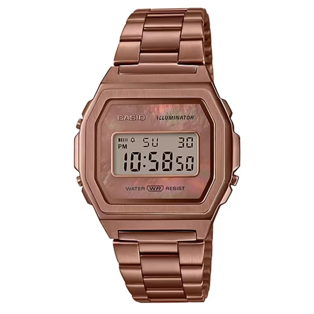 Reloj digital Casio vintage A1000RG-5VT con esfera de n car. Recubrimiento en color de oro rosa con ba¤o de iones o en la banda y la caja. Las caracter¡sticas adicionales incluyen alarma diaria y luz s£per LED.