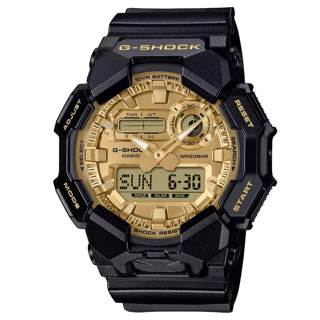Cada vez m s fuerte. Haga una declaraci¢n audaz y con confianza con un G-SHOCK en llamativo negro y dorado. El cuerpo completamente negro_ resistente como cualquier G-SHOCK_ brilla con detalles en color dorado y texturas reflejadas para lograr un aspecto completamente atrevido y definitivamente interesante. La correa y la carcasa tienen un acabado con revestimiento brillante para ofrecer un aspecto elegante e impecable.