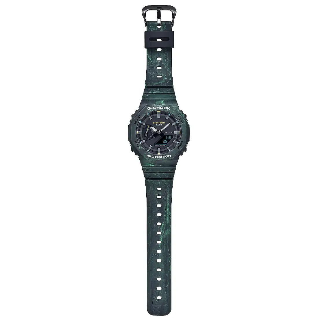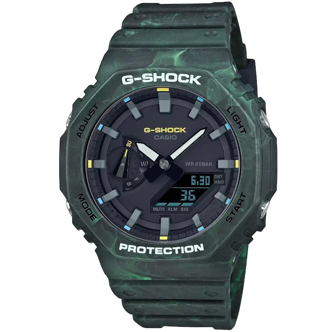 Avent£rese en bosques misteriosos y paisajes m gicos con los colores tenues llenos de misterio de G-SHOCK. Con marcos y correas elaborados de resinas de colores mixtos_ estos relojes Mystic Forest presentan un acabado £nico que evoca espirales de pintura con verde y amarillo_ marr¢n y naranja.