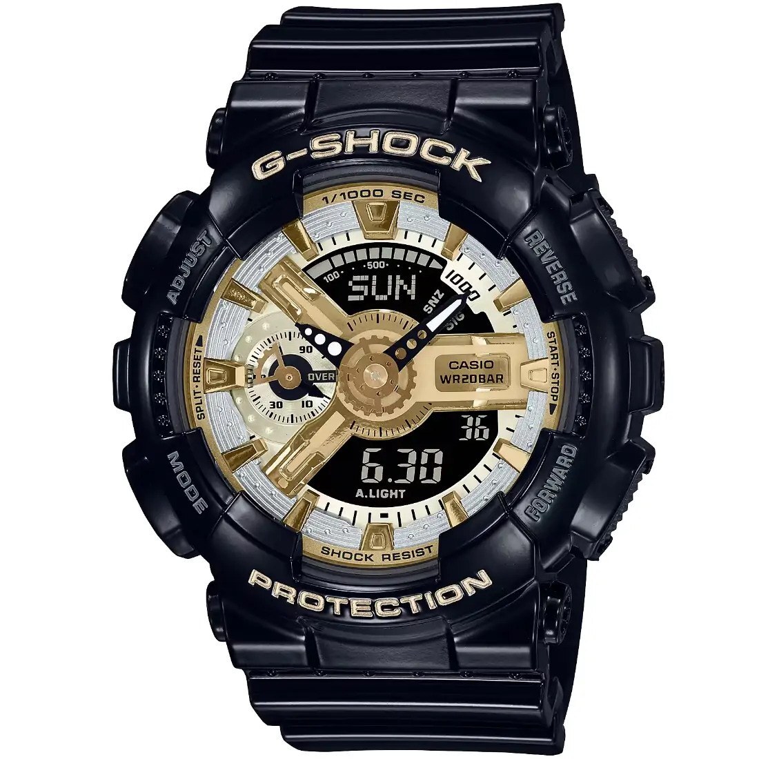 Disfrute del ic¢nico GA-110 de gran tama¤o con una esfera de reloj dise¤ada para profundidad y dimensi¢n y numerosos componentes finos_ todo en un reloj con un perfil m s peque¤o. Un esquema de colores de dos tonos de oro brillante y plata elegante acent£a la cl sica carcasa negra de G-SHOCK. En un dise¤o m s compacto para el accesorio de moda casual perfecto para los fan ticos m s j¢venes de G-SHOCK.