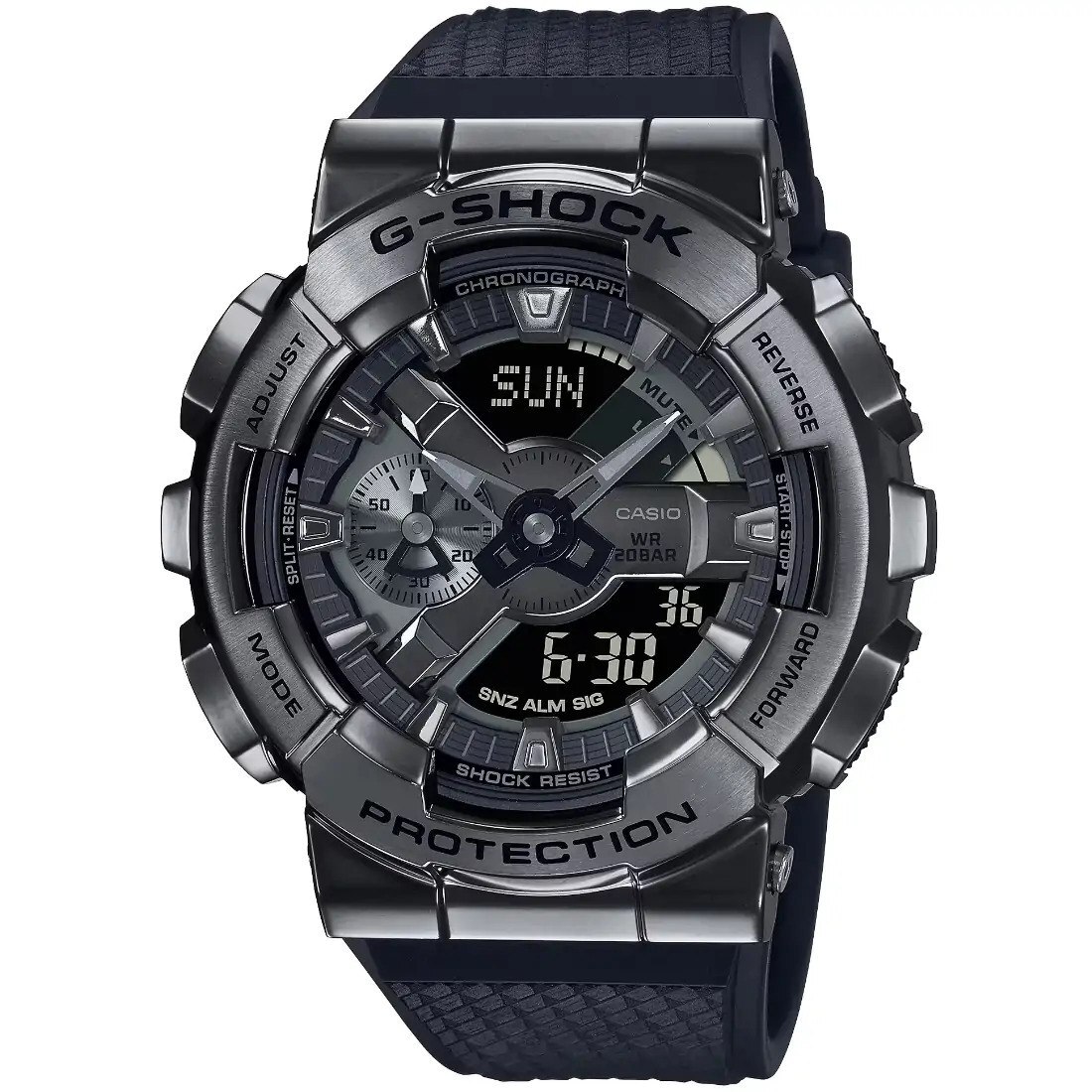 Utilice metal en negro con un G-SHOCK que transmite fuerza_ firmeza y elegancia. El marco de metal_ con un acabado de ba¤o de iones negro_ expresa de forma elegante y con estilo su sentido del dise¤o. Elija entre el GM-2100 con el popular marco octagonal o el GM-110 con su carcasa redonda de gran tama¤o. En cualquiera de los dos casos_ obtendr una expresi¢n de moda totalmente en negro con una sensaci¢n de lujo y un aspecto vers til. Listo para ir donde quiera.