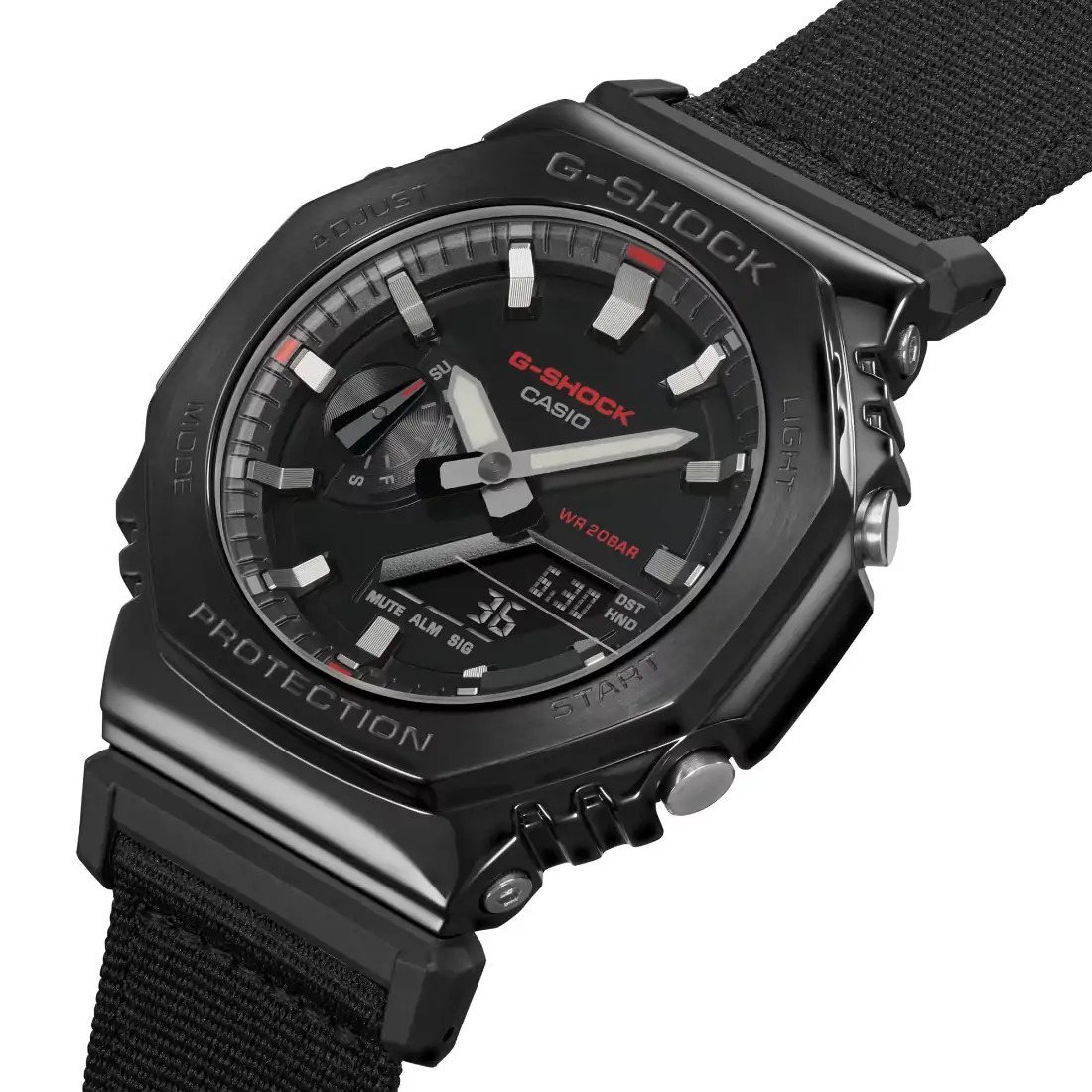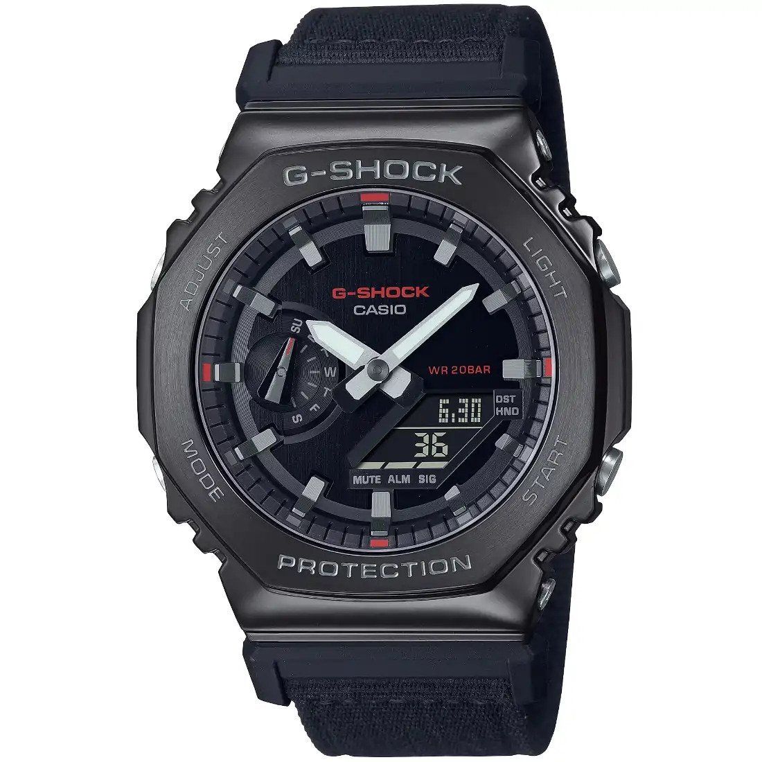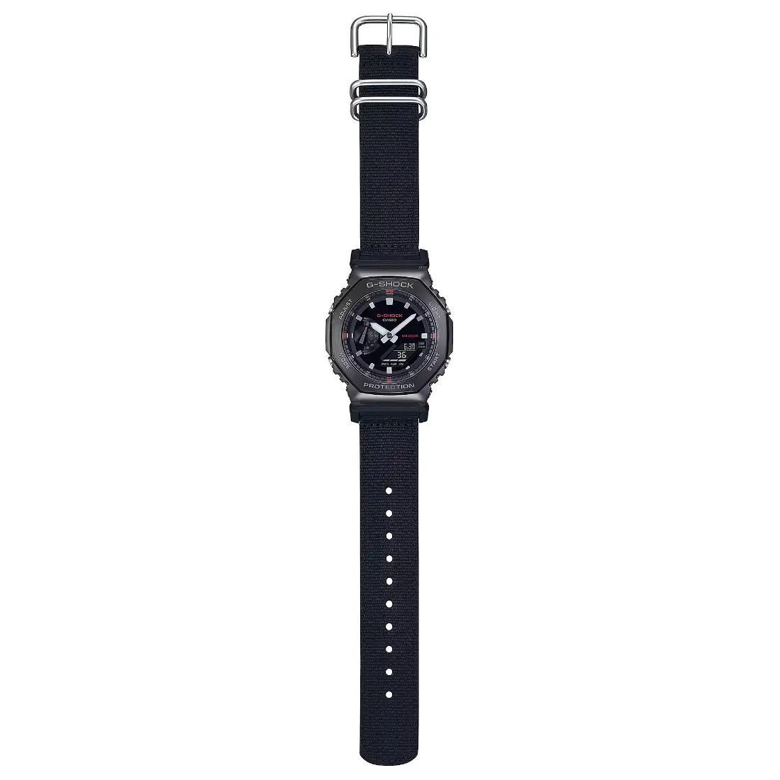 Agregue un toque funcional a su estilo con un G-SHOCK de la colecci¢n Utility Metal. Estos innovadores relojes toman la ic¢nica forma octagonal y el dise¤o met lico de la l¡nea GM-2100 y lo acompa¤an con una correa de tela casual en un color funcional que combina con cualquier atuendo. El llamativo contraste del metal y la tela ofrece un estilo s¢lido que es pura resistencia y sofisticaci¢n casual.