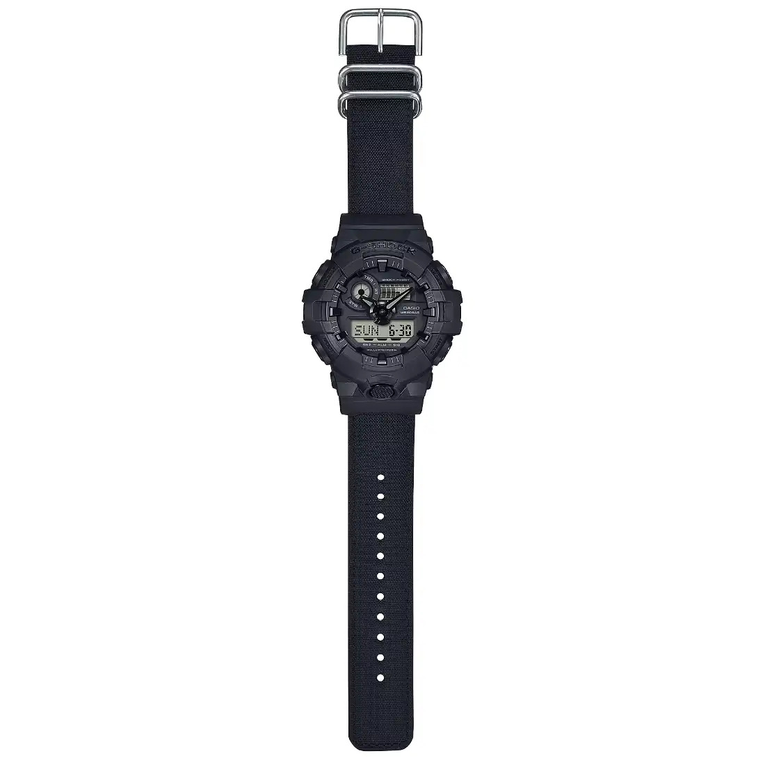Este G-SHOCK con correa de nailon Cordura_ pr ctico para la calle y ecol¢gico al mismo tiempo_ ofrece todo lo que necesita. El moderno dise¤o completamente negro se complementa con una correa hecha de nailon Cordura ecol¢gico_ lo que crea un aspecto fresco y vers til que le permite alternar sin problemas entre el trabajo y el ocio.