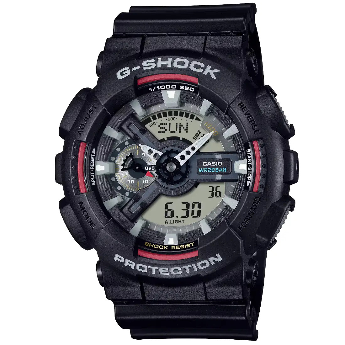 Un destacado con una carcasa grande. El esquema de colores original se reproduce fielmente con toques de G-SHOCK rojo_ que representa la pasi¢n por asumir los desaf¡os; azul_ que simboliza una excelente resistencia al agua; y amarillo_ que significa una excelente resistencia a los golpes.