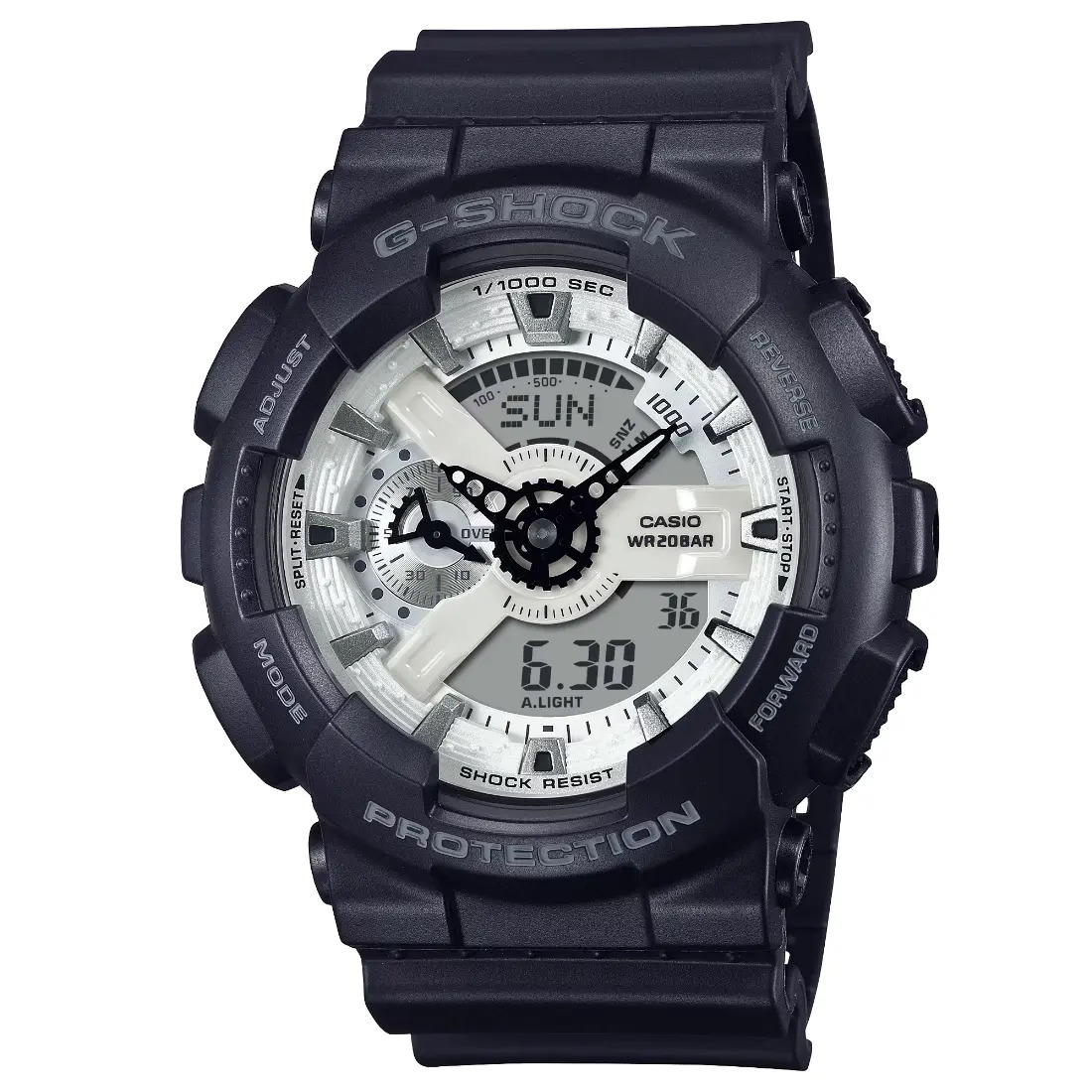 El G-SHOCK en blanco y negro es la combinaci¢n perfecta de audacia y elegancia. Su base negra azabache se complementa con un brillante dial blanco de deposici¢n de vapor_ creando un contraste monocrom tico £nico.
