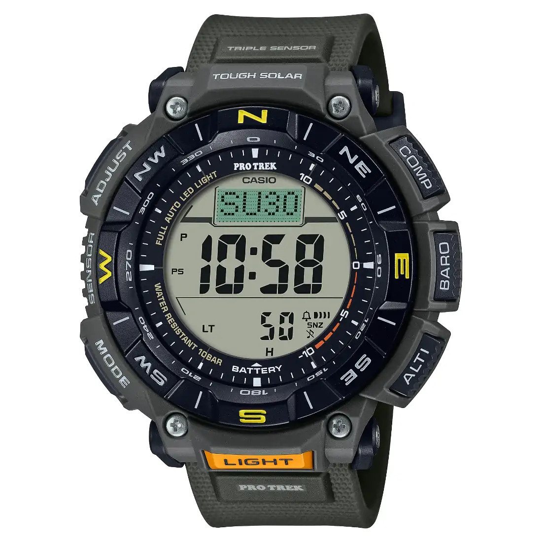 Salga al aire libre con un PRO TREK con funcionamiento con energía solar que cuenta con materiales ecológicos que cuidan el medioambiente. La línea PRO TREK de auténticos equipos para actividades al aire libre para los amantes de la naturaleza presenta el PRG-340, un reloj que incorpora plásticos de biomasa* respetuosos con el medioambiente, a la vez que ofrece el mismo ajuste cómodo para su muñeca.