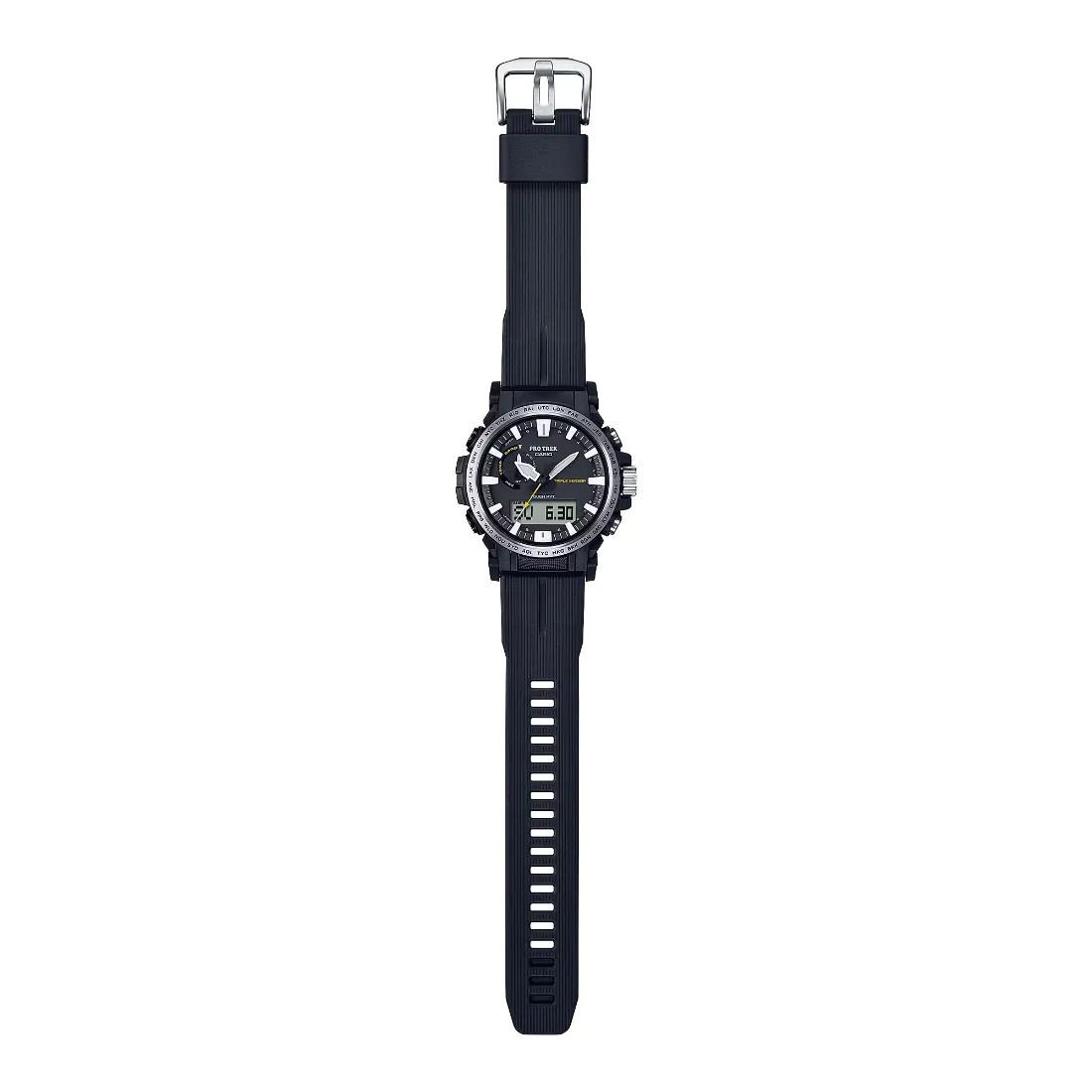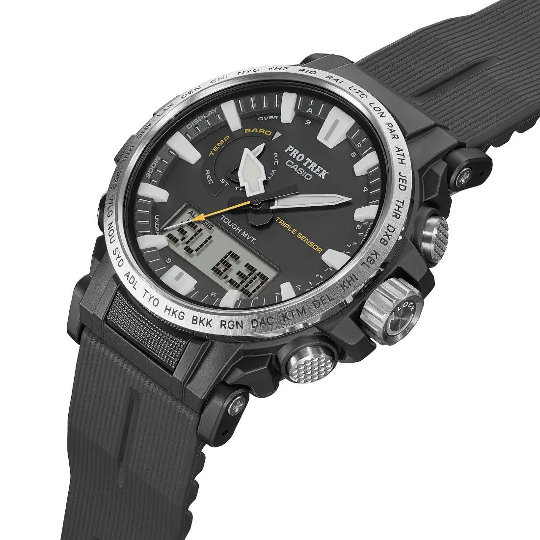 La marca PRO TREK es sinónimo de experimentación, goce y preservación de las maravillas de la naturaleza. El PRW-61 tiene plásticos de biomasa ecológicos en la carcasa, la correa y la parte posterior. Por primera vez en un reloj PRO TREK o Casio, la carcasa y la correa están fabricadas con plásticos de biomasa ecológicos, en lugar de resinas convencionales. El uso de plásticos de biomasa también ofrece resistencia al uso intensivo y comodidad en la muñeca sin concesiones.