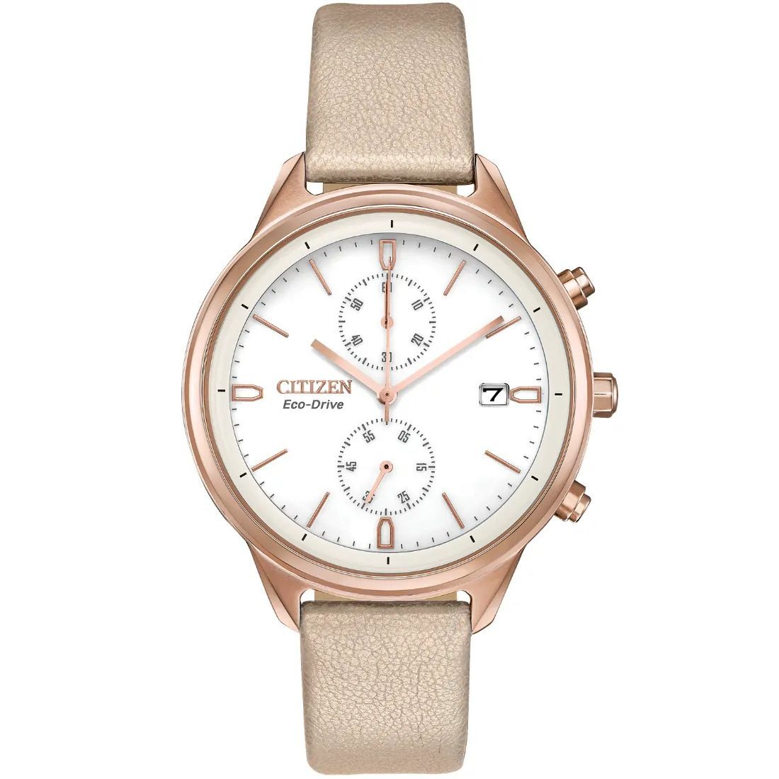 Este reloj CITIZEN Chandler es la pieza perfecta para el d¡a a d¡a por sus cl sicas l¡neas y sutil dise¤o femenino. Con una caja de acero inoxidable en tono oro rosa y car tula blanca que se complementa con la correa de piel vegana rosada. Cuenta con un cron¢grafo que mide hasta 60 minutos en unidades de 1/5 segundos y fechador.
