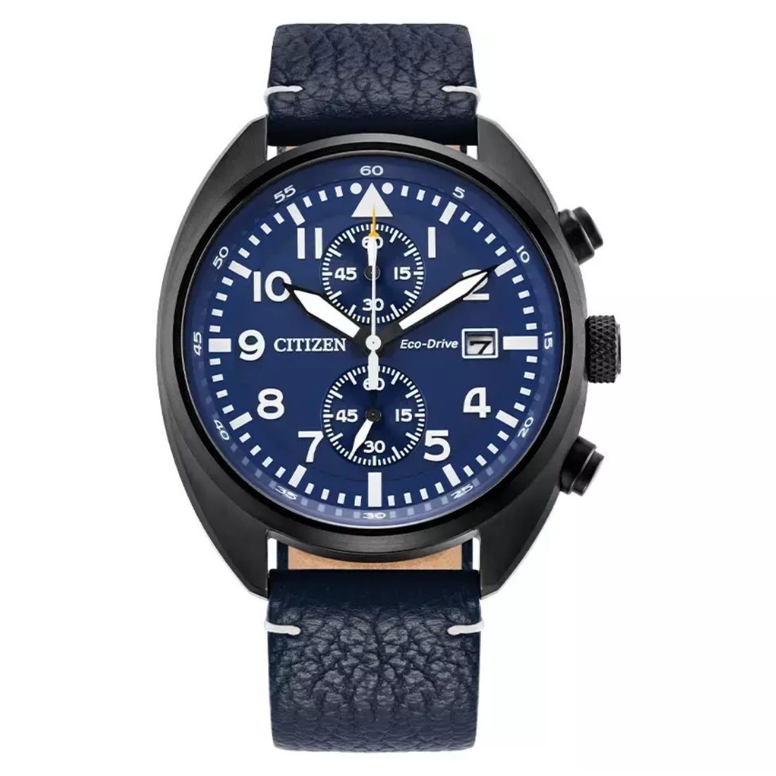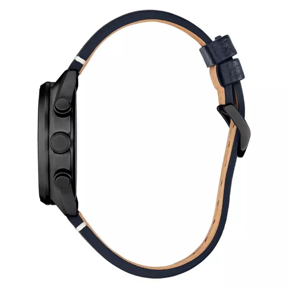 Toma acci¢n y demuestra el coraje que llevas dentro con el vers til estilo del £ltimo cron¢grafo Sport Casual. El reloj cuenta con una caja de 41 mm de acero inoxidable chapada en ion negro con modernos pulsadores escalonados y una corona profundamente estriada. Un acabado en arena a¤ade encanto deportivo al reloj_ que se sujeta a la mu¤eca con una correa de piel azul marino. En la car tula azul marino se aprecia el dise¤o del cron¢grafo inspirado en la aviaci¢n_ con detalles en blanco y una ventana de fecha a las 3 en punto.