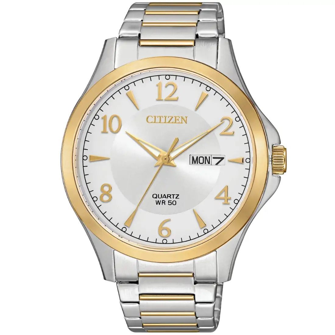 Reloj Citizen Cuarzo BF2005-54Aÿpara caballero con movimiento de cuarzo. Luce una caja de acero inoxidable y brazalete bitono. Su car tula plateada cuenta con d¡a y fecha.