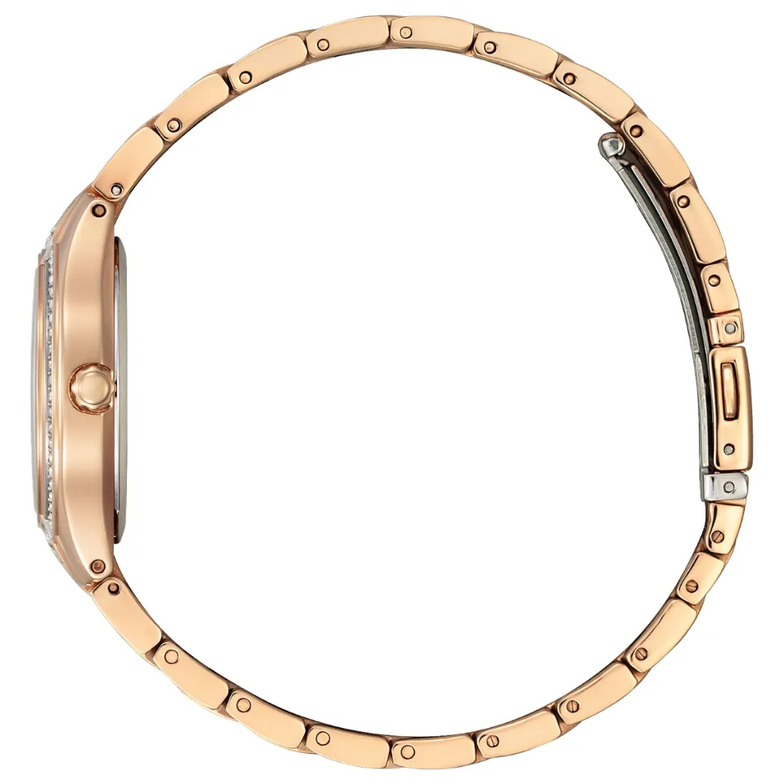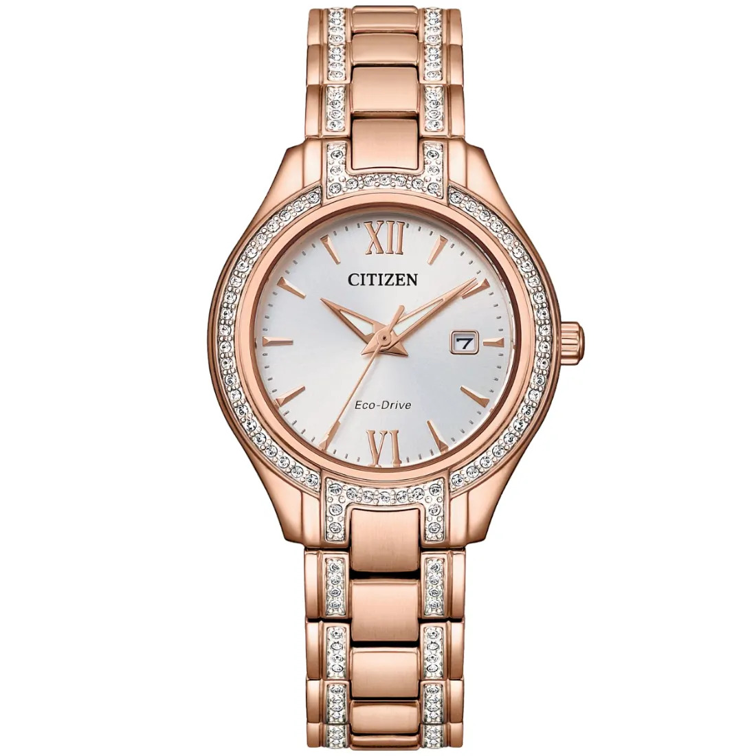 Cuando se trata de lo £ltimo en relojes para mujer_ la colecci¢n Silhouette Crystal de CITIZEN© se lleva el primer premio. La caja y el brazalete de acero inoxidable en tono oro rosa se combinan con un car tula plateada con fechador. Cuenta con un total de 114 cristales genuinos incrustados en la caja y el brazalete que lo convierten en un reloj femenino y actual que se ver genial con cualquier estilo y en cualquier ocasi¢n.