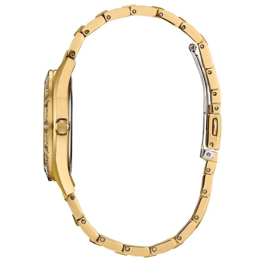 Haz una brillante declaraci¢n de estilo con el £ltimo reloj de vestir para mujer de la colecci¢n Crystal. Este elegante reloj brilla intensamente con cristales que rodean la caja y el brazalete de acero inoxidable en tono dorado. La caja est acentuada por una car tula tipo madre perla de tres manecillas e indicadores de cristales. Con tecnolog¡a Eco-Drive que se alimenta de forma sostenible con cualquier luz y nunca necesita bater¡a_ este moderno reloj agregar brillo a su estilo de d¡a a noche y una elegancia moderna a su mu¤eca.