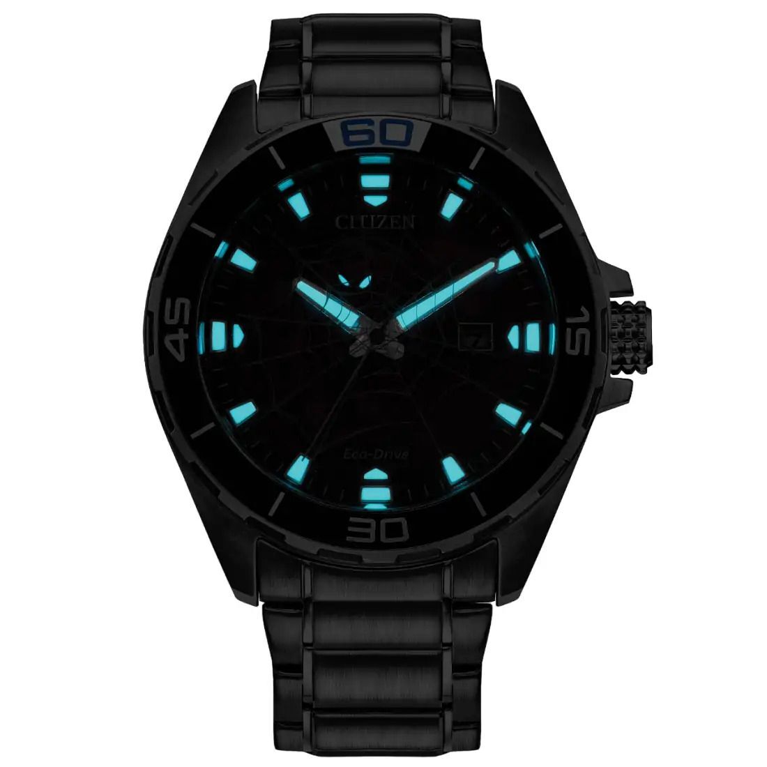 Spider-Man se convierte en el centro de atenci¢n con este nuevo reloj de la colecci¢n CITIZEN© x Marvel que seguramente despertar tu sentido ar cnido. La caja y el brazalete de acero inoxidable plateado se complementan con un bisel negro_ creando un aspecto ultrarresistente y llamativo. La car tula presenta un fondo azul degradado_ con una parte exterior m s oscura y una central m s brillante que resalta la ilustraci¢n de Spider-Man. El superhroe aparece en posici¢n agachada con su caracter¡stica telara¤a impresa bajo el cristal para crear dimensi¢n. Con poca luz_ la esfera adquiere mayor dinamismo gracias a los indicadores geomtricos luminosos que brillan junto con los ojos de Spider-Man.