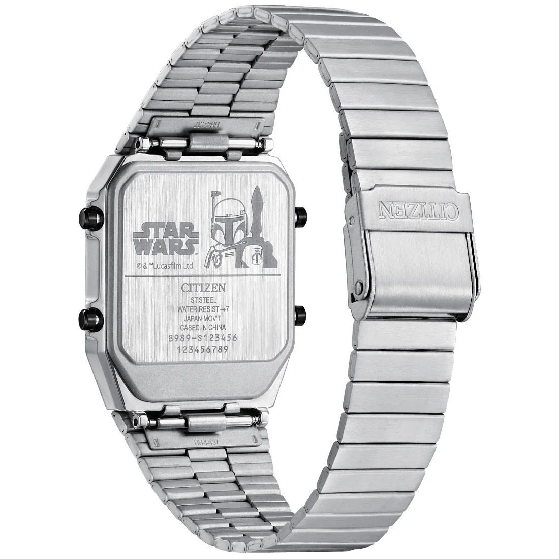 Inspirado en un reloj an logo-digital CITIZEN© de la dcada de los 80_ la fuerza de Boba Fett se honra en la caja rectangular de acero inoxidable y en la car tula con colores verde olivo y rojo_ as¡ como el ic¢nico s¡mbolo mandalore. Este significativo reloj cuenta con hora dual_ cron¢grafo_ alarma_ fecha y sensor de temperatura Celsius_ en un dise¤o exclusivo de CITIZEN©. Si admiras al un maestro del combate cuya misi¢n es ser un l¡der en la galaxia cercana y lejana_ querr s tener el poder de Boba Fett a tu lado y en tu mu¤eca