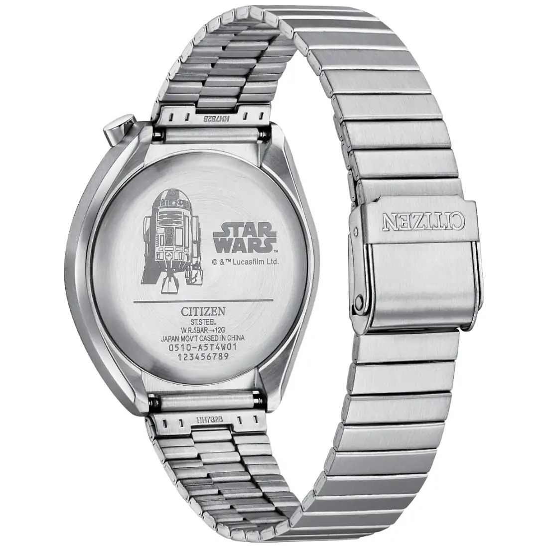El conjunto de funciones del reloj inspirado en R2-D2 de la colecci¢n Star Wars | CITIZEN©? te har tan ingenioso como el mism¡simo droide astromec nico. La caja de acero inoxidable en tono plateado refleja el dise¤o de R2-D2_ al igual que la car tula_ que tiene un aspecto en relieve que recuerda a sus paneles y est acentuada con los distintivos detalles azules y rojos de R2-D2. La subcar tula en la posici¢n de las 6 tambin tiene un detalle de R2-D2 en miniatura_ y el reloj cuenta con cron¢grafo_ fechador y brazalete de acero inoxidable plateado. El logotipo cl sico de Star Wars est grabado en el reverso de la caja_ junto con una intrincada imagen del obediente droide.