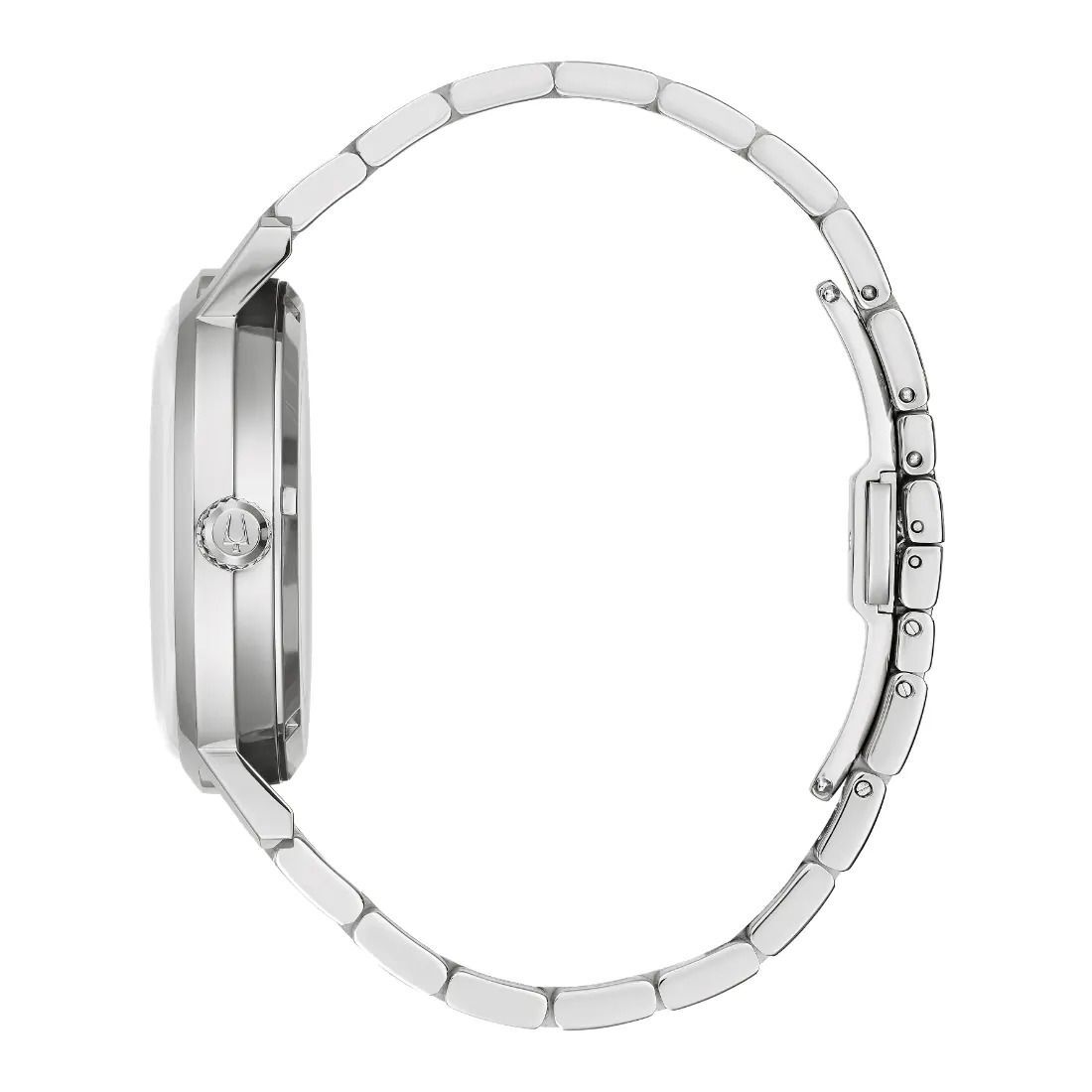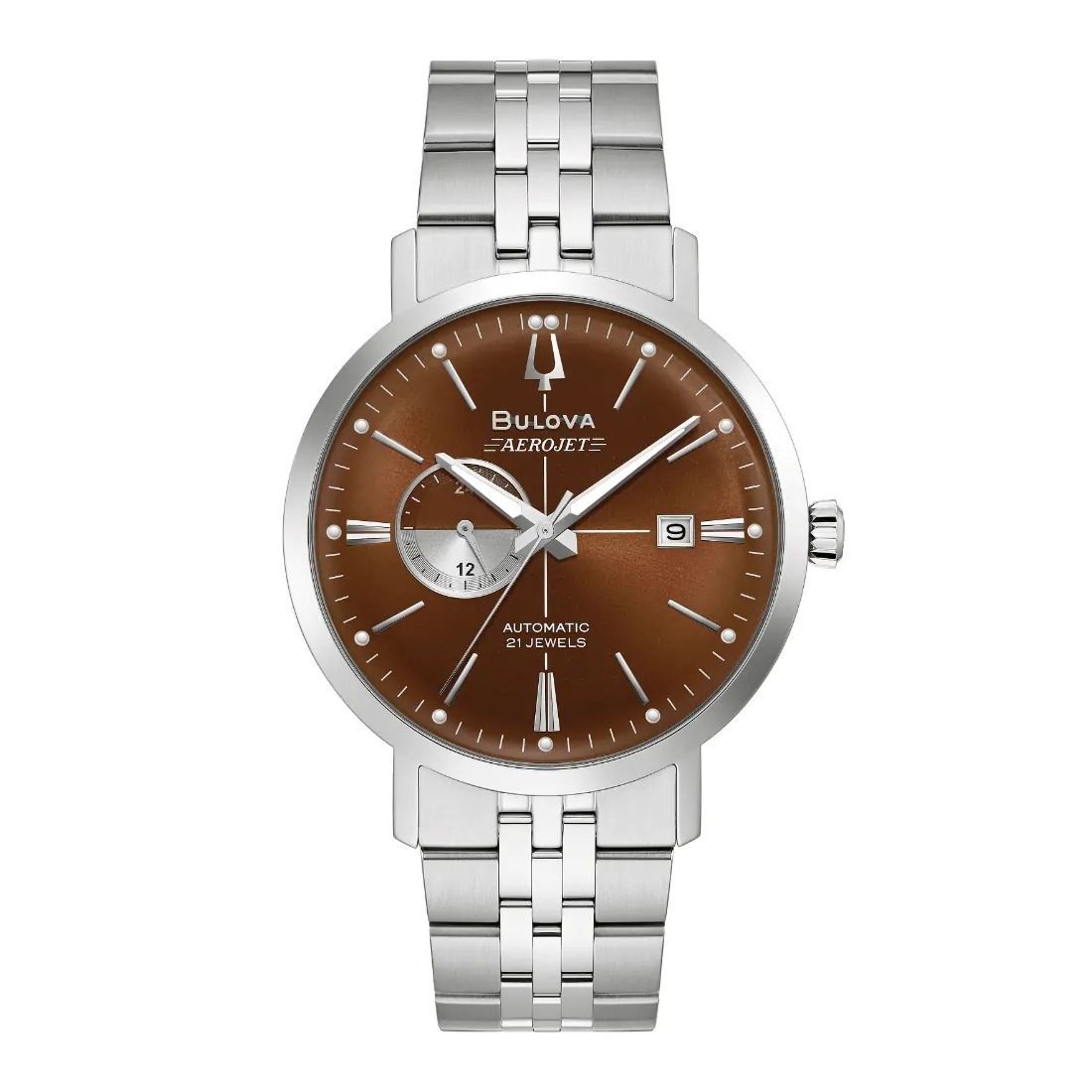 Reloj Bulova para caballero Colección Aerojet. Movimiento mecánico de cuerda automática de 3 manecillas, subcarátula indicador día y noche y fechador. Reserva de marcha de 42 horas. Caja y brazalete realizados en acero inoxidable, broche desplegable de doble pulsador. Carátula café con efectos de rayo de sol, indicadores y manecillas luminiscentes en plateado, logo vintage Aerojet. Tapa transparente. Cristal mineral.