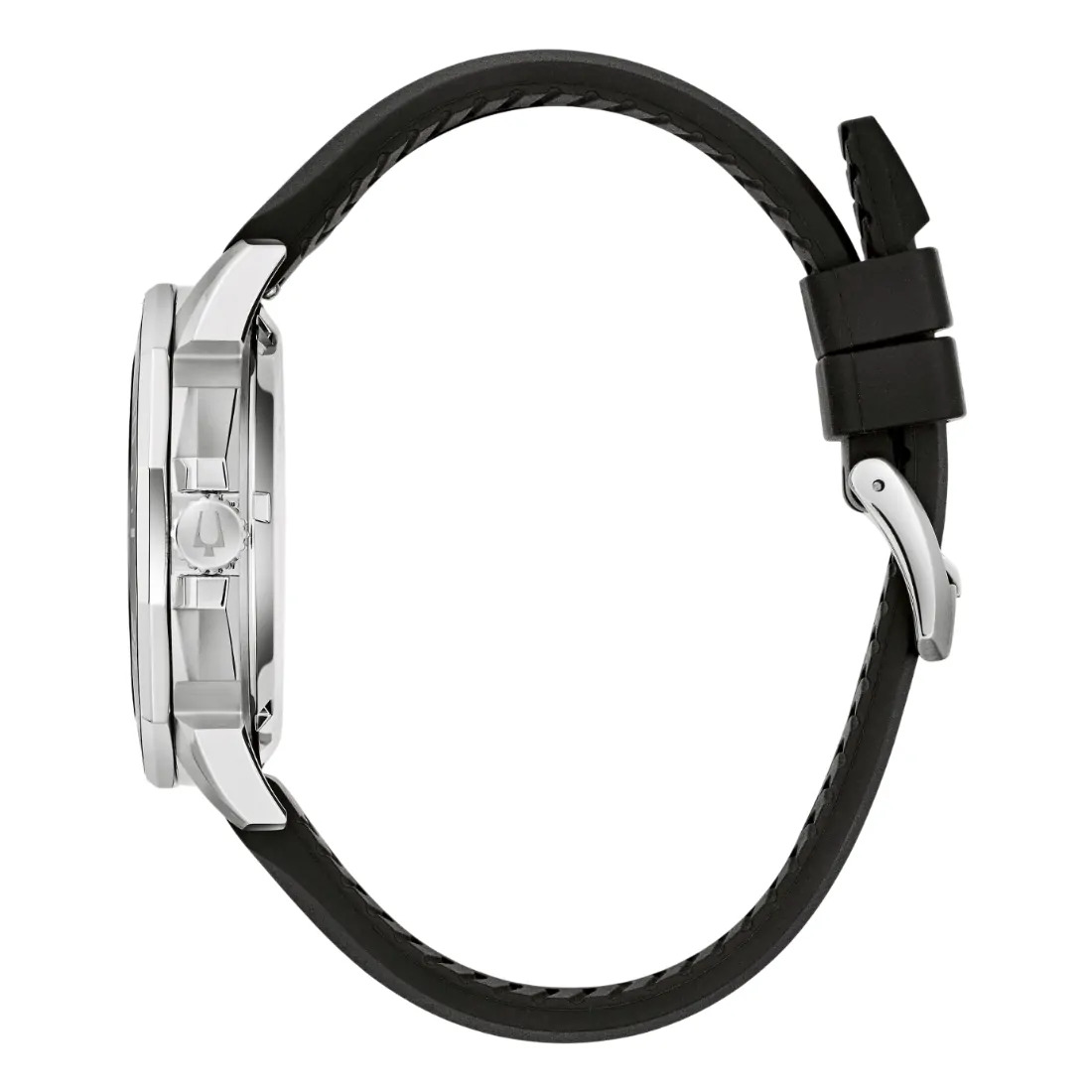 Reloj Bulova colección Marine Star para Caballero. nMovimiento Precisionist de 3 manecillas y fechador. nCaja en forma poligónica realizada en acero inoxidable. nBisel superior unidireccional de tiempo transcurrido en acero con inserto de cerámica negro. nCarátula texturizada que asemeja las olas de mar en amarillo, indicadores y manecillas luminiscentes; segundero de movimiento continuo con detalle rojo en punta. nCorrea de caucho negra, broche tipo hebilla de 3 piezas. nCristal de zafiro con tratamiento antirreflejante. nResistencia al agua de hasta 200 metros.