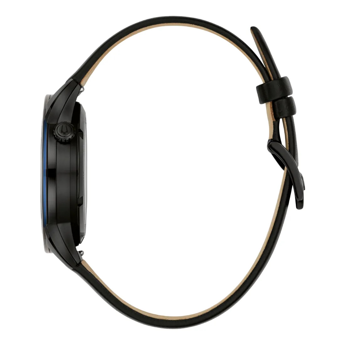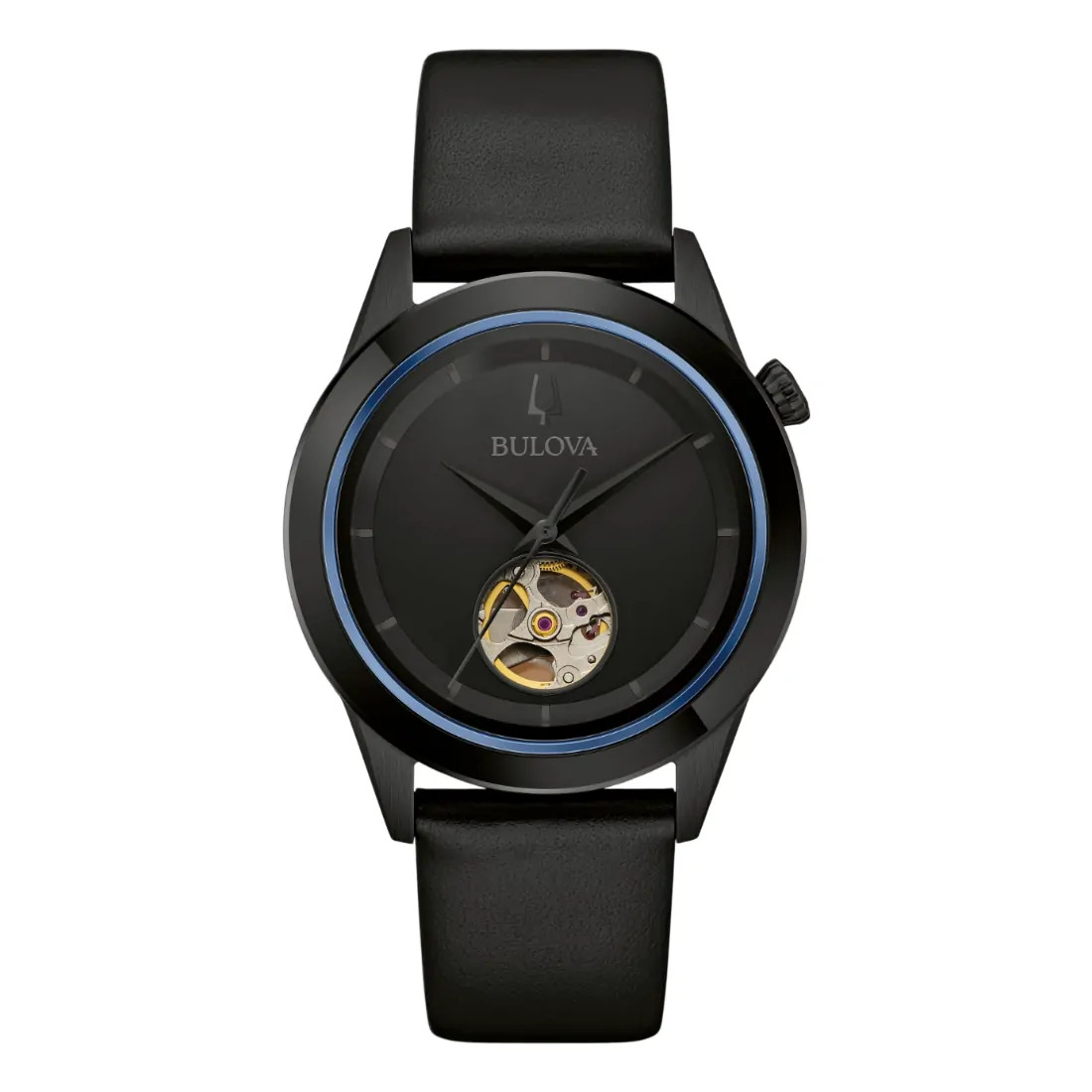Reloj Bulova para Caballero colección Modern. Movimiento mecánico de cuerda automática de 3 manecillas y 21 joyas. Reserva de marcha de 42 horas. Caja realizada en acero inoxidable acabado PVD negro, bisel superior en azul. Carátula negra con apertura que permite observar el movimiento en funcionamiento del reloj, indicadores, manecillas y corona en negro. Cristal de zafiro con tratamiento antirreflejante. Correa de piel suave en negro, broche tipo hebilla de 3 piezas. Tapa trasera transparente. Resistencia al agua de hasta 30 metros. Caja 40mm