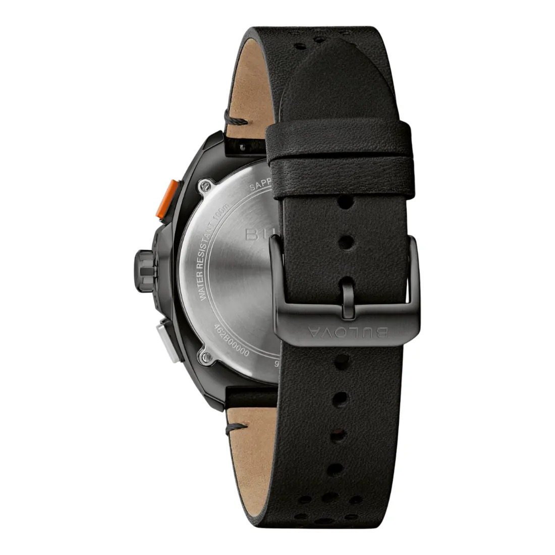 nCarátula negra, indicadores y manecillas luminiscentes, detalle naranja en segundero.