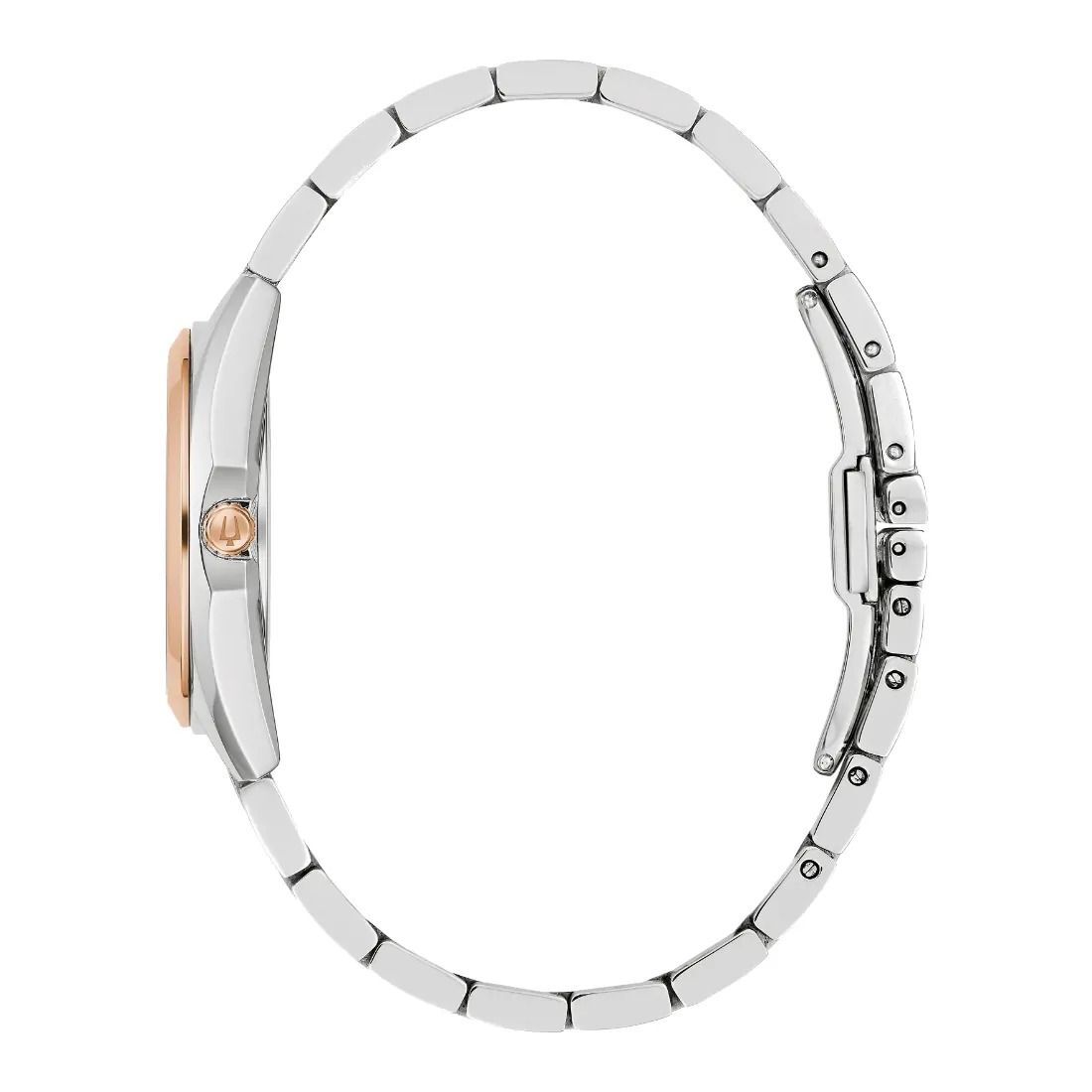 Blanco con detalles en oro rosa. 11 diamantes montados a mano como indicadores.