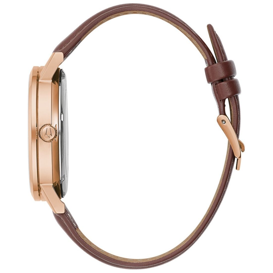 Reloj Bulova mecánico de cuerda automática Colección Sutton para caballero. Movimiento mecánico de cuerda automática de 3 manecillas. Caja realizada en acero inoxidable en acabado PVD oro rosa, Correa de piel café, broche tipo hebilla. Carátula esqueletada con detalles en tono oro rosa que permite ver el mecanismo en funcionamiento del reloj, indicadores y manecillas en dorado, cristal mineral.