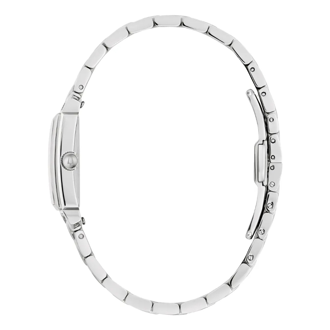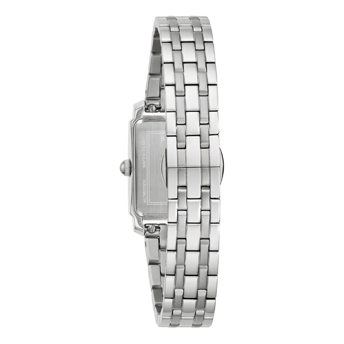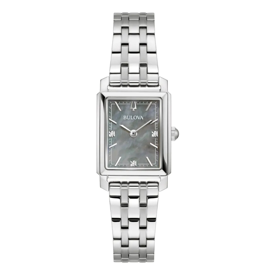 Reloj Bulova para Dama, colección Sutton. n3 diamantes montados a mano de forma individual. nMovimiento de cuarzo de 2 manecillas. nCaja rectangular y brazalete realizados en acero inoxidable, broche desplegable de doble pulsador. nCarátula en Madre Perla gris, indicadores y manecillas en plateado. nCristal mineral. nResistencia al agua de hasta 30 metros.