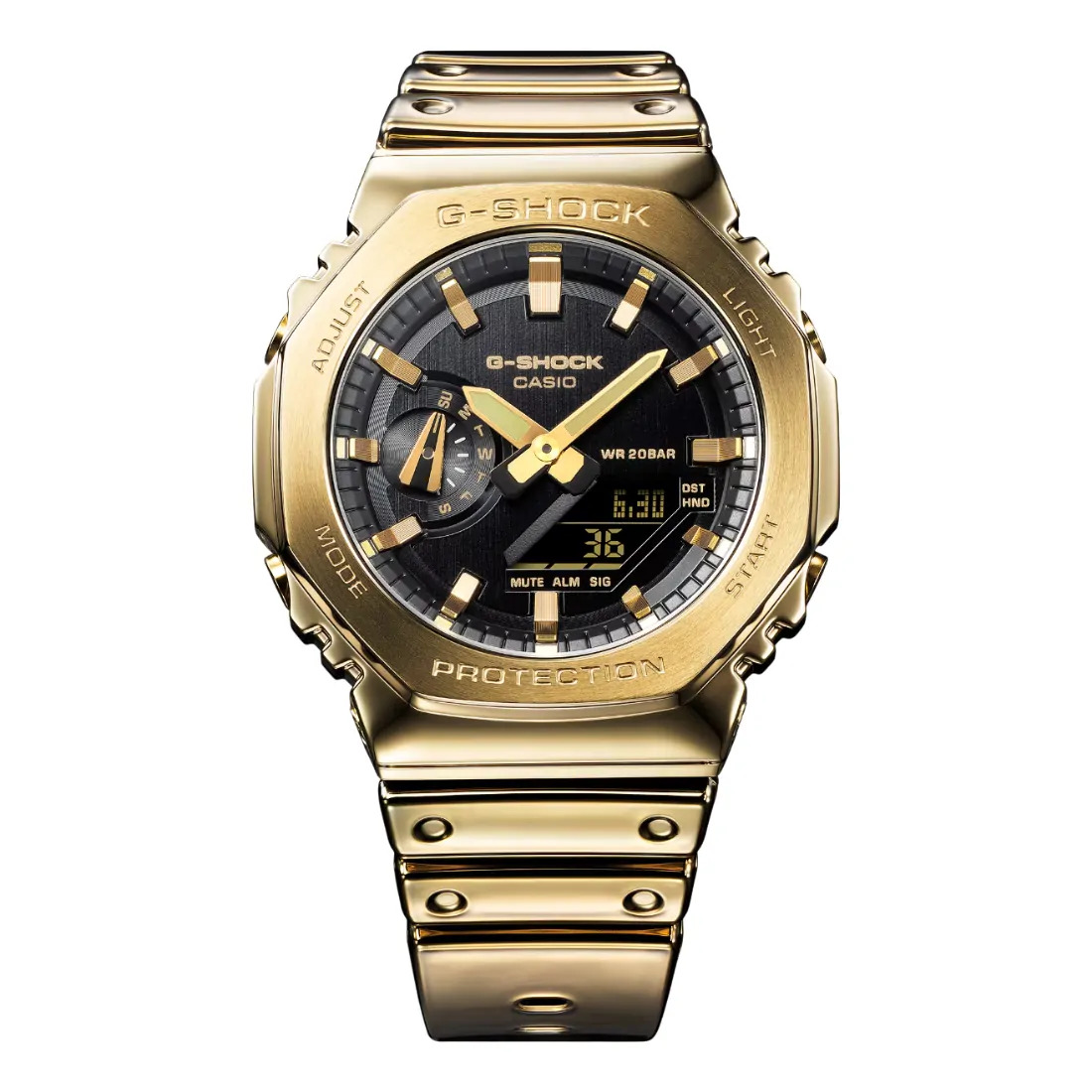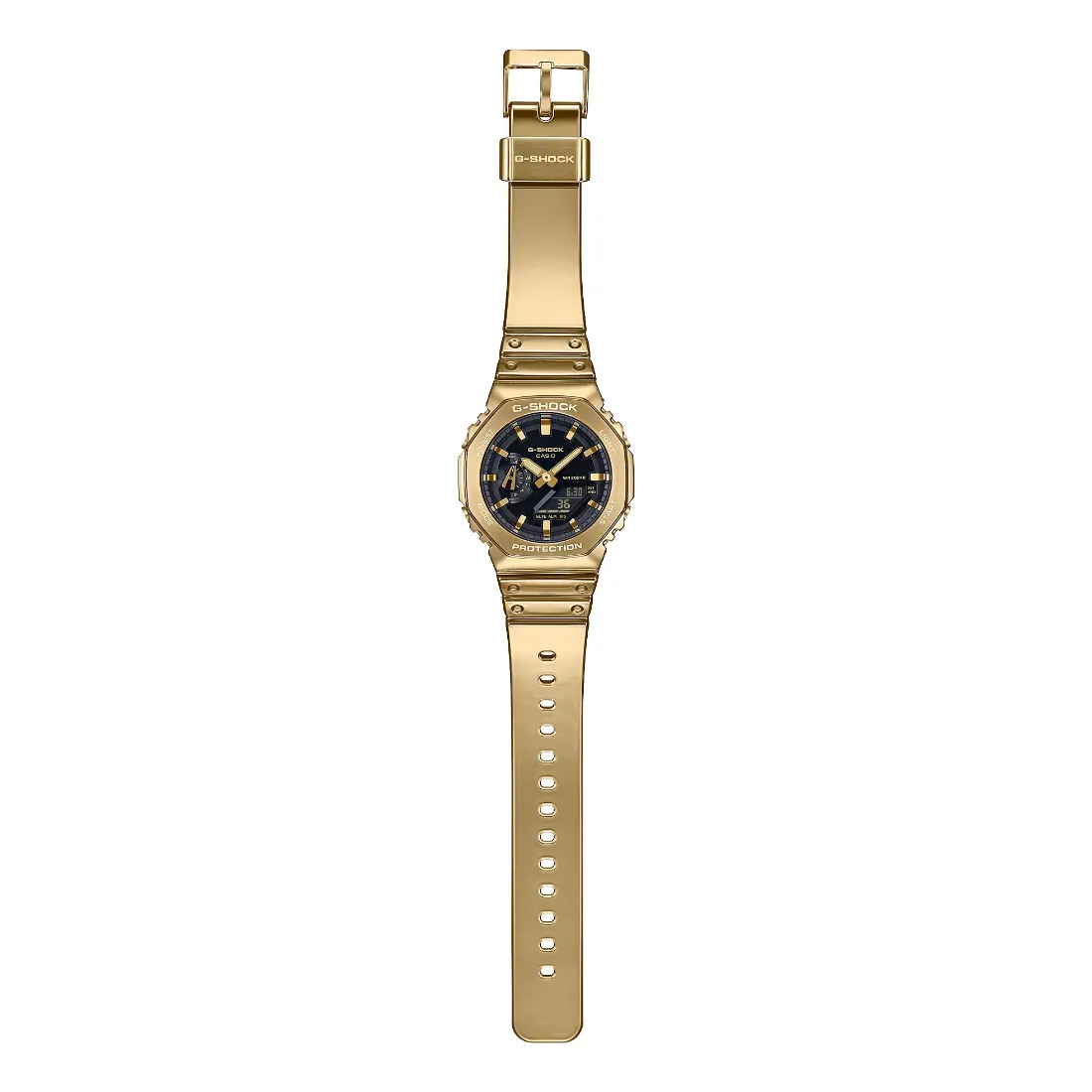 El G-STEEL en color dorado fusiona resistencia y lujo con un diseño monocromático único. Su correa de silicona ultra resistente, con acabado metalizado por deposición de vapor, proporciona un ajuste cómodo y un look sofisticado. Ideal para quienes buscan un reloj de moda con tecnología avanzada y materiales premium. Elija su favorito: el icónico GM-2100 con marco octogonal.