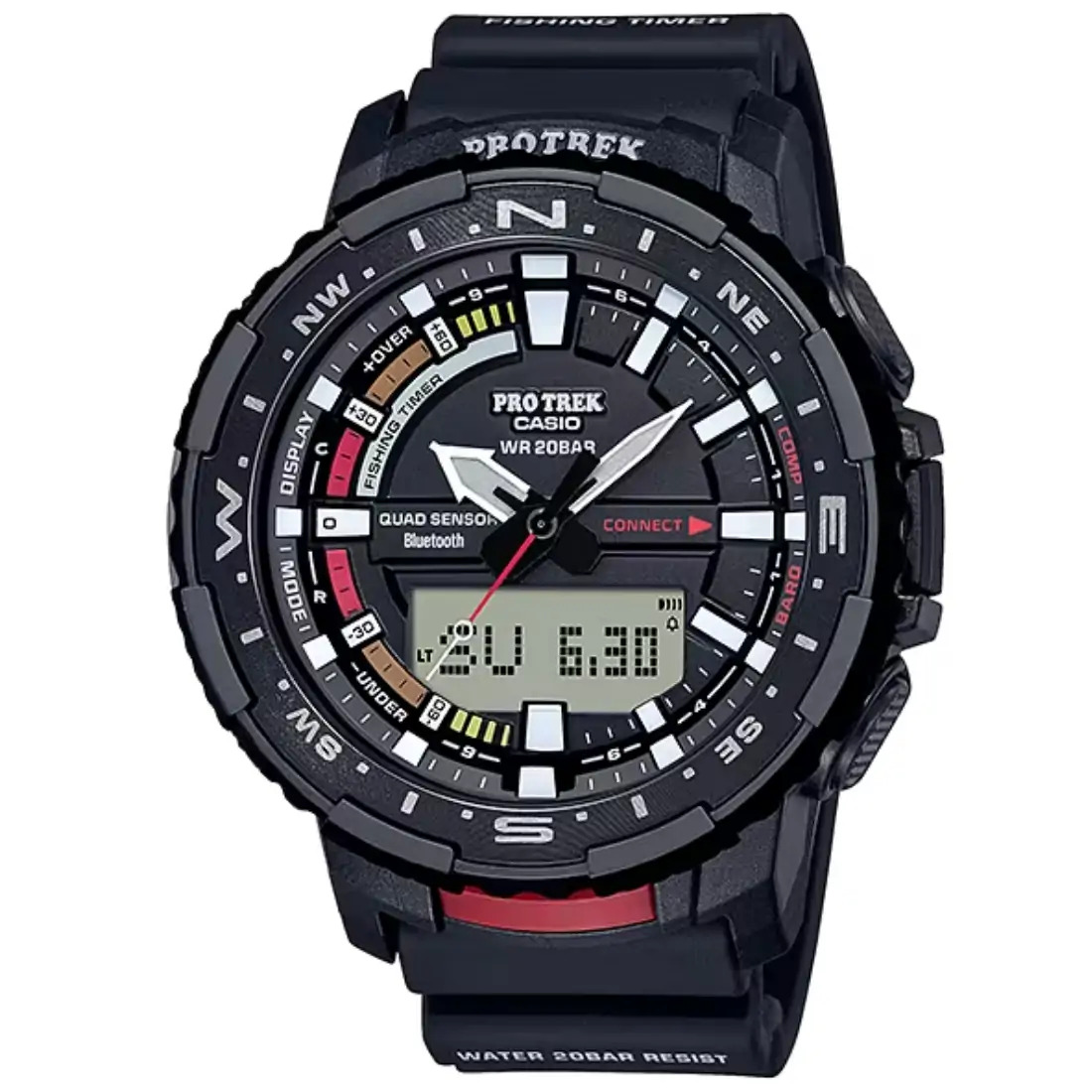 Analógica: 3 manecillas (hora, minuto [la manecilla se mueve cada 10 segundos], segundo) Digital: horas, minutos, segundos, a. m./p. m., mes, fecha, día