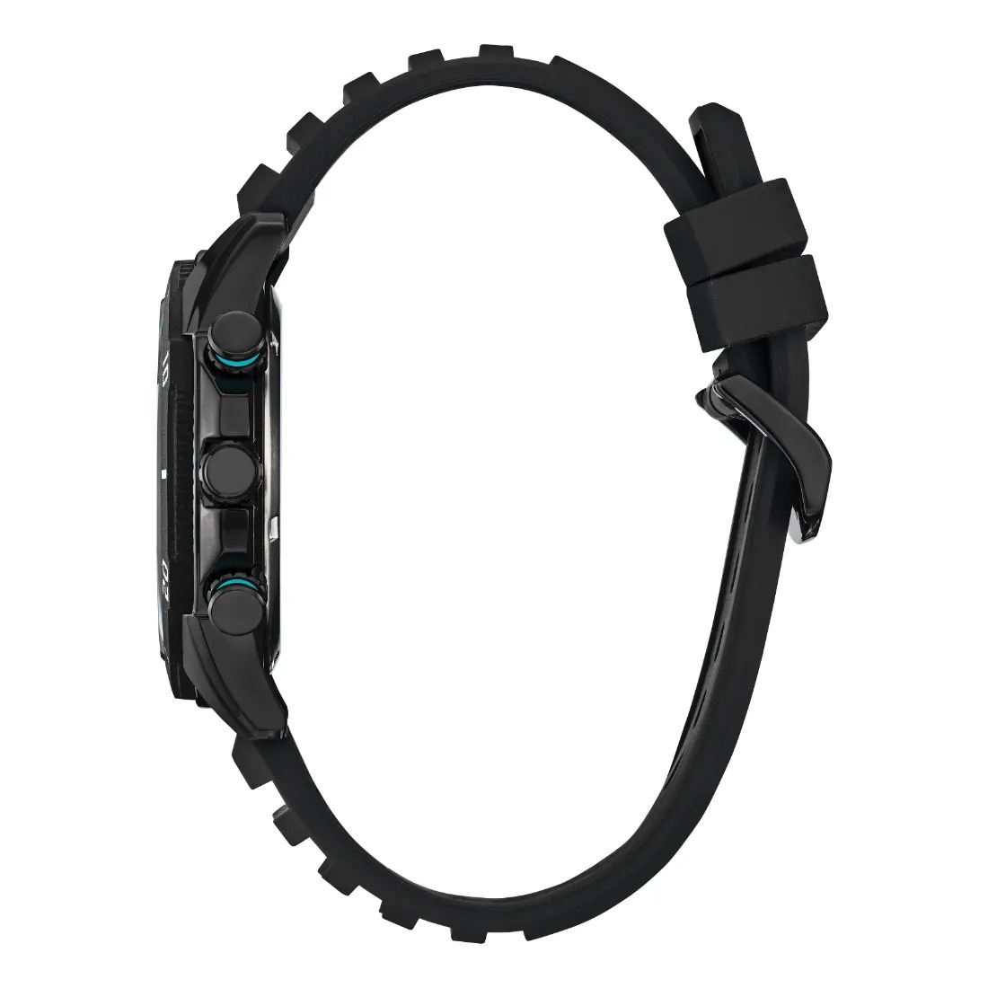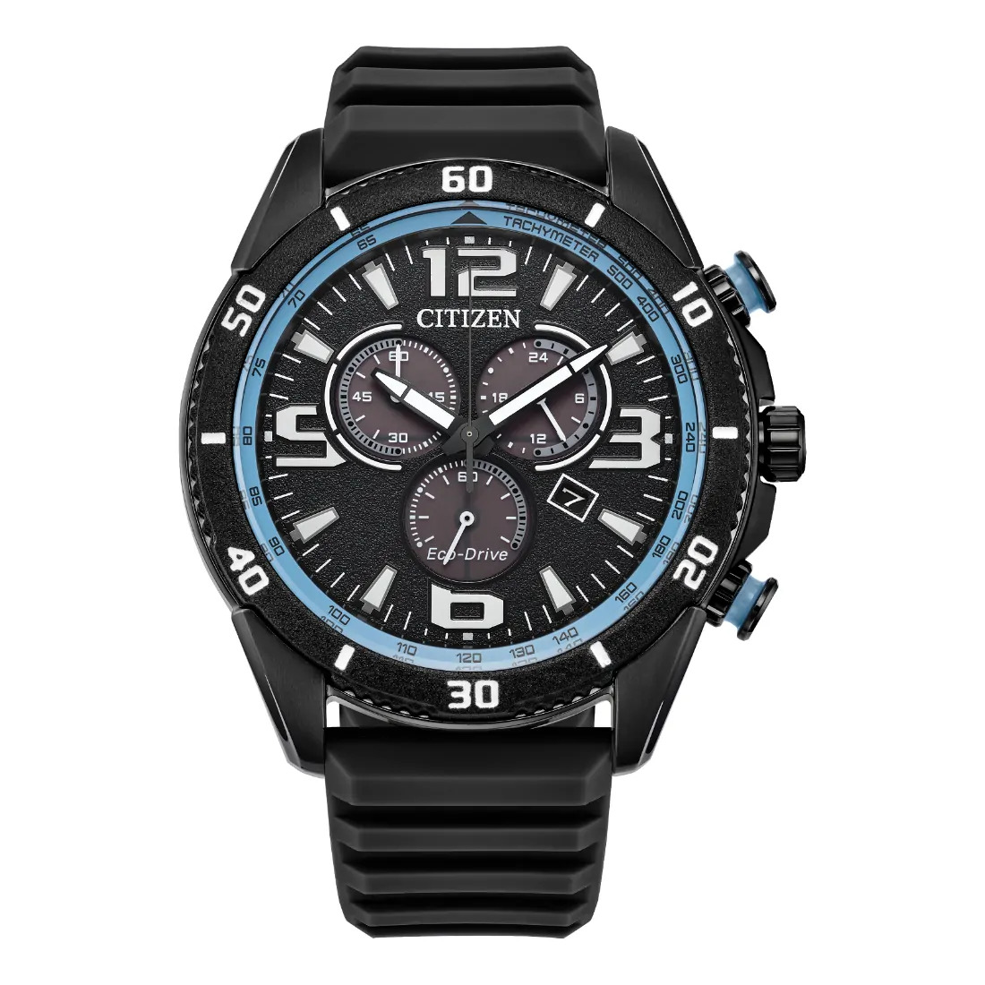 Atrevido y deportivo, este nuevo cronógrafo Brycen de Citizen está listo para cualquier aventura. El reloj mide 44.8 mm con caja ern acero inoxidable color negro acentuada con detalles azules en sus pulsadores de estilo deportivo. Un bisel giratorio de 60 minutos añade funcionalidad, mientras que una resistente correa de silicón negro sujeta el reloj a la muñeca. n nEn la carátula, el estilo deportivo continúa, con manecillas e indicadores luminosos que marcan la hora haciendola más legible a la vista, mientras que una escala taquimétrica azul claro perfila la pantalla. Las funciones avanzadas incluyen un cronógrafo de 1 segundo que mide hasta 60 minutos, hora 12/24 y la subcarátula de fecha en la posición de las 4 en punto. Este modelo Brycen de alto rendimiento se alimenta de forma sostenible con cualquier tipo de luz gracias a la tecnología Eco-Drive patentada por Citizen que nunca requiere cambio de batería. Resistente al agua hasta 100 metros. Calibre H500.